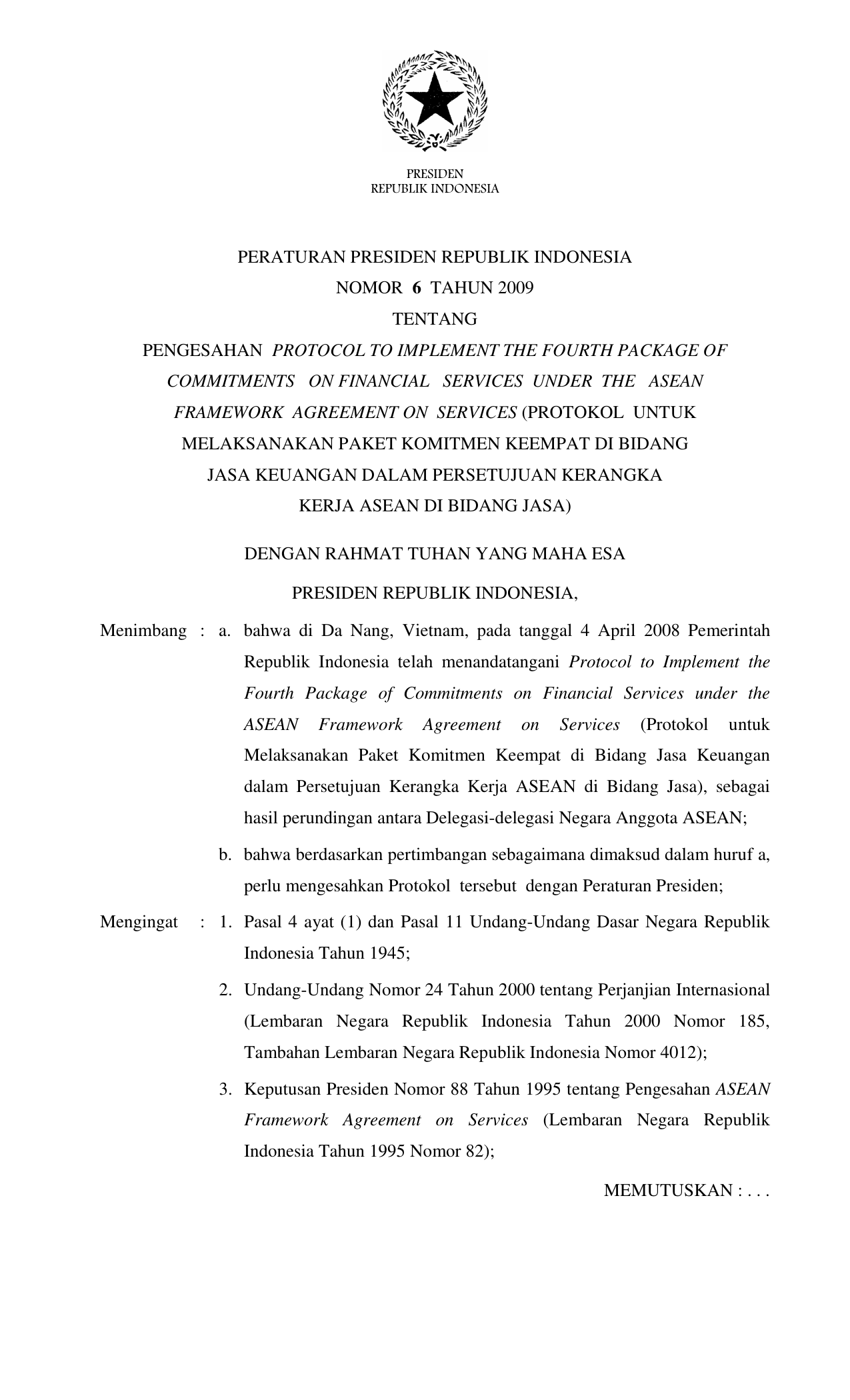 PERPRES Nomor 6 Tahun 2009 | Peraturan Presiden Nomor 6 Tahun 2009 tentang PENGESAHAN PROTOCOL TO IMPLEMENT THE FOURTH PACKAGE OF COMMITMENTS ON FINANCIAL SERVICES UNDER THE ASEAN FRAMEWORK AGREEMENT ON SERVICES (PROTOKOL UNTUK MELAKSANAKAN PAKET KOMITMEN KEEMPAT DIBIDANG JASA KEUANGAN DALAM PERSETUJUAN KERANGKA KERJA ASEAN DI BIDANG JASA