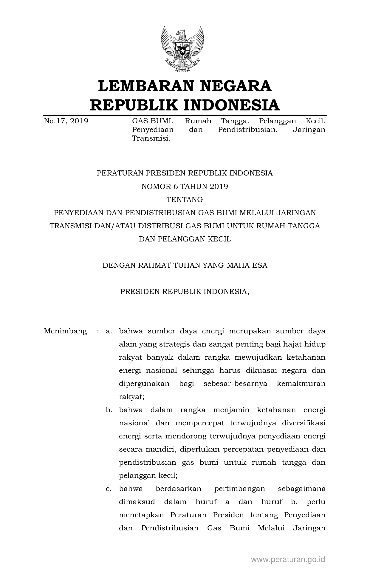 PERPRES Nomor 6 Tahun 2019 | Peraturan Presiden Nomor 6 Tahun 2019 tentang PENYEDIAAN DAN PENDISTRIBUSIAN GAS BUMI MELALUI JARINGAN TRANSMISI DAN/ATAU DISTRIBUSI GAS BUMI UNTUK RUMAH TANGGA DAN PELANGGAN KECIL