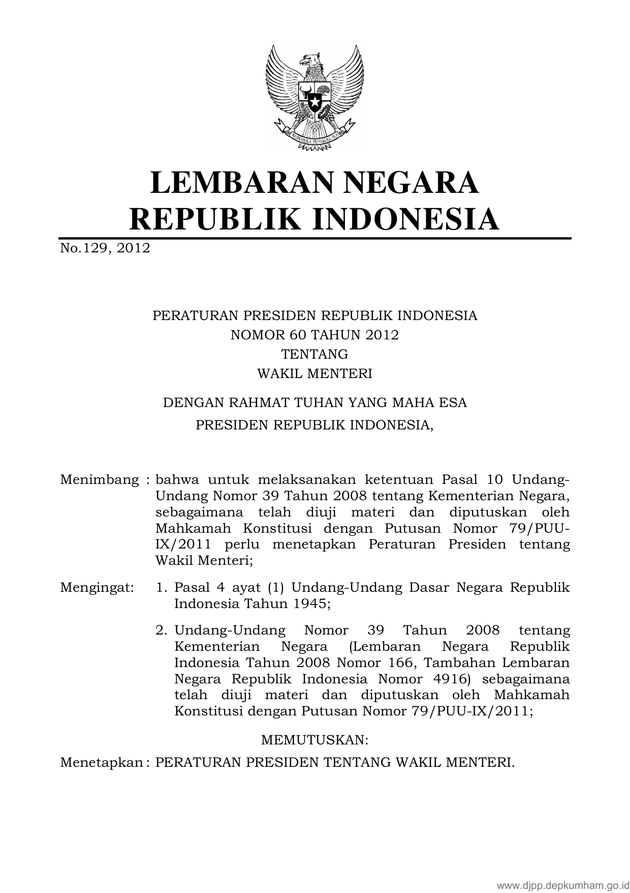 PERPRES Nomor 60 Tahun 2012 | Peraturan Presiden Nomor 60 Tahun 2012 tentang WAKIL MENTERI