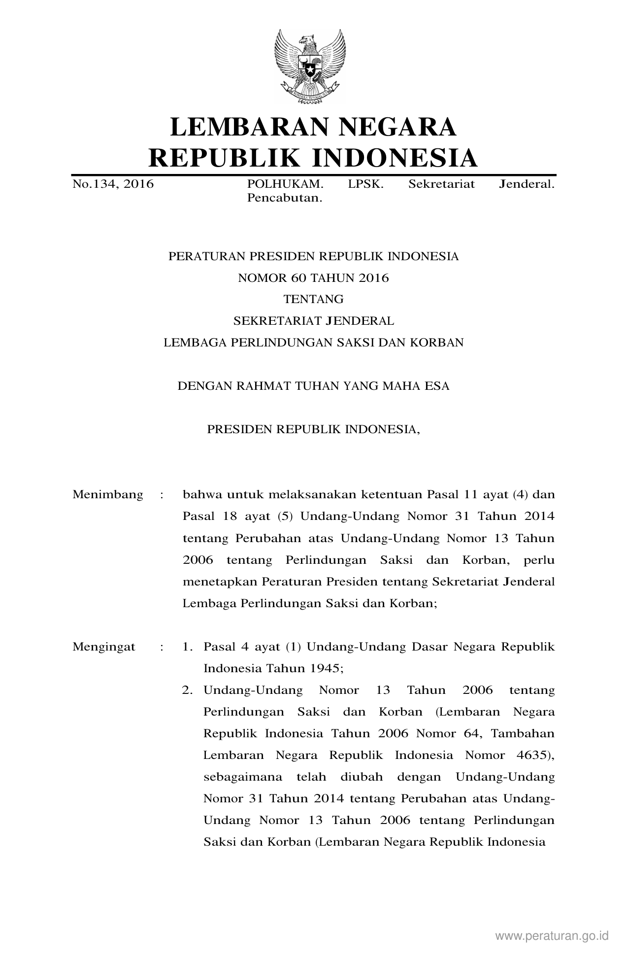 PERPRES Nomor 60 Tahun 2016 | Peraturan Presiden Nomor 60 Tahun 2016 tentang SEKRETARIAT JENDERAL LEMBAGA PERLINDUNGAN SAKSI DAN KORBAN