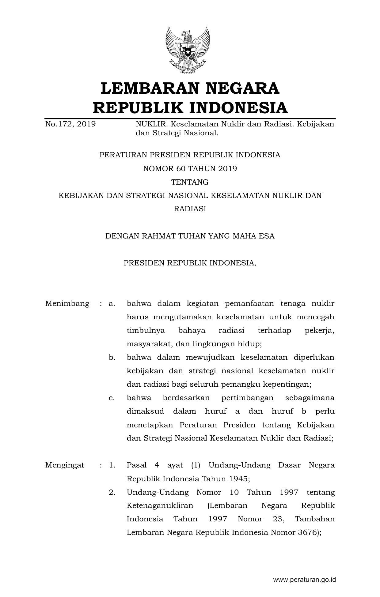 PERPRES Nomor 60 Tahun 2019 | Peraturan Presiden Nomor 60 Tahun 2019 tentang KEBIJAKAN DAN STRATEGI NASIONAL KESELAMATAN NUKLIR DAN RADIASI