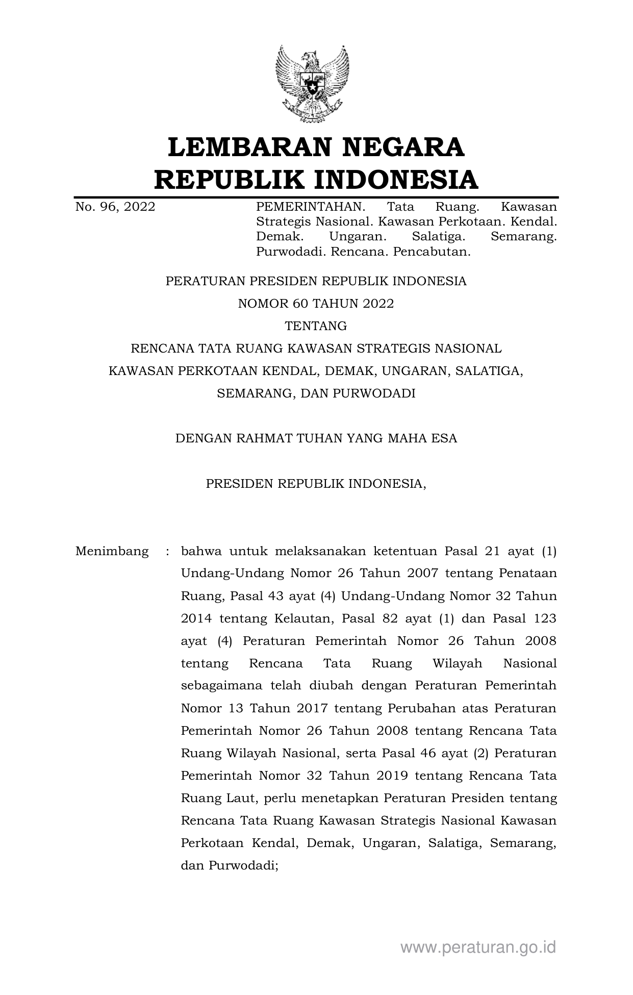 PERPRES Nomor 60 Tahun 2022 | Peraturan Presiden Nomor 60 Tahun 2022 tentang RENCANA TATA RUANG KAWASAN STRATEGIS NASIONAL KAWASAN PERKOTAAN KENDAL, DEMAK, UNGARAN, SALATIGA, SEMARANG, DAN PURWODADI