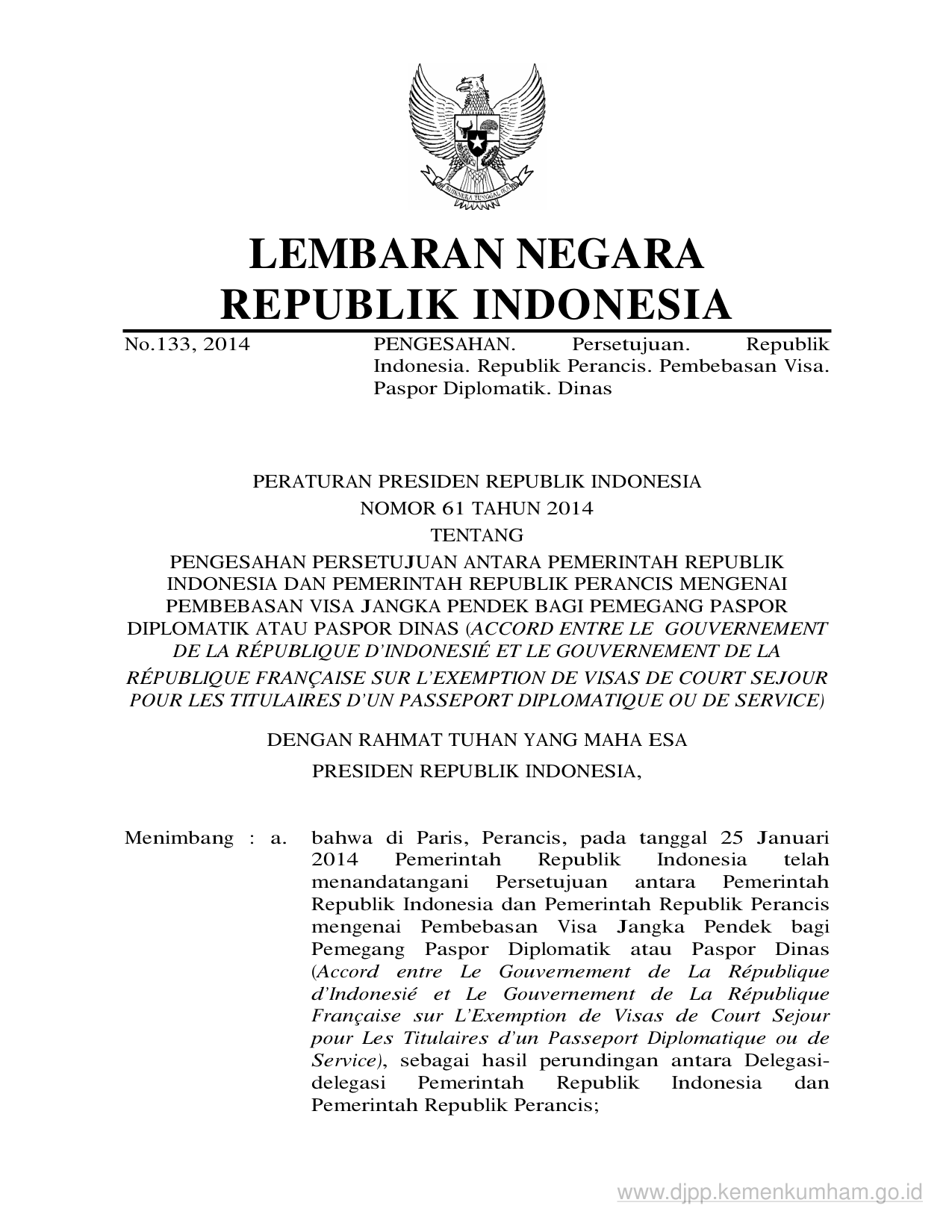 PERPRES Nomor 61 Tahun 2014 | Peraturan Presiden Nomor 61 Tahun 2014 tentang PENGESAHAN PERSETUJUAN ANTARA PEMERINTAH REPUBLIK INDONESIA DAN PEMERINTAH REPUBLIK PERANCIS MENGENAI PEMBEBASAN VISA JANGKA PENDEK BAGI PEMEGANG PASPOR DIPLOMATIK ATAU PASPOR DINAS (ACCORD ENTRE LE GOUVERNEMENT DE LA RÉPUBLIQUE D'INDONESIÉ ET LE GOUVERNEMENT DE LA RÉPUBLIQUE FRANÇAISE SUR L'EXEMPTION DE VISAS DE COURT SEJOUR POUR LES TITULAIRES D'UN PASSEPORT DIPLOMATIQUE OU DE SERVICE)