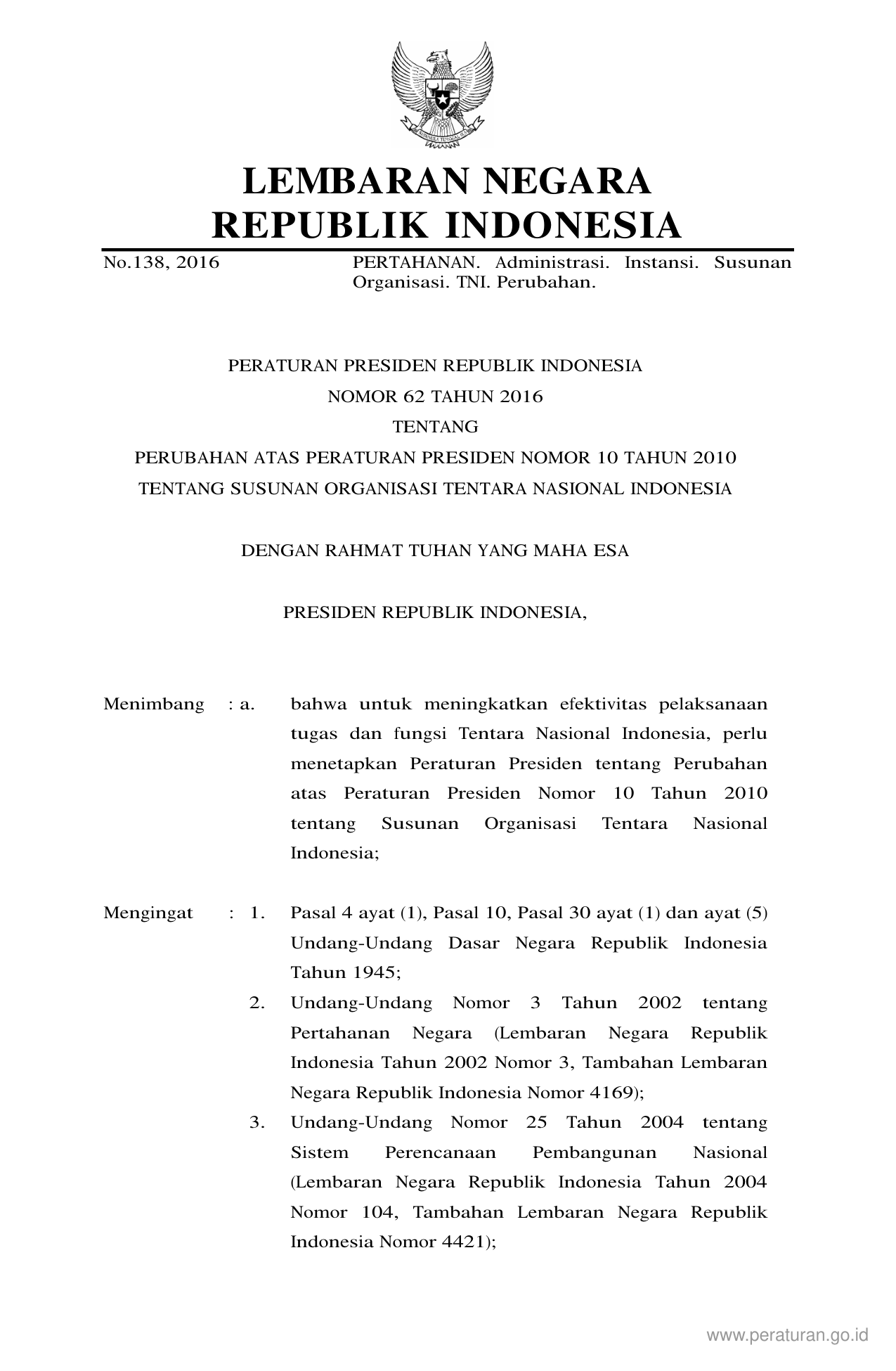 PERPRES Nomor 62 Tahun 2016 | Peraturan Presiden Nomor 62 Tahun 2016 tentang PERUBAHAN ATAS PERATURAN PRESIDEN NOMOR 10 TAHUN 2010 TENTANG SUSUNAN ORGANISASI TENTARA NASIONAL INDONESIA