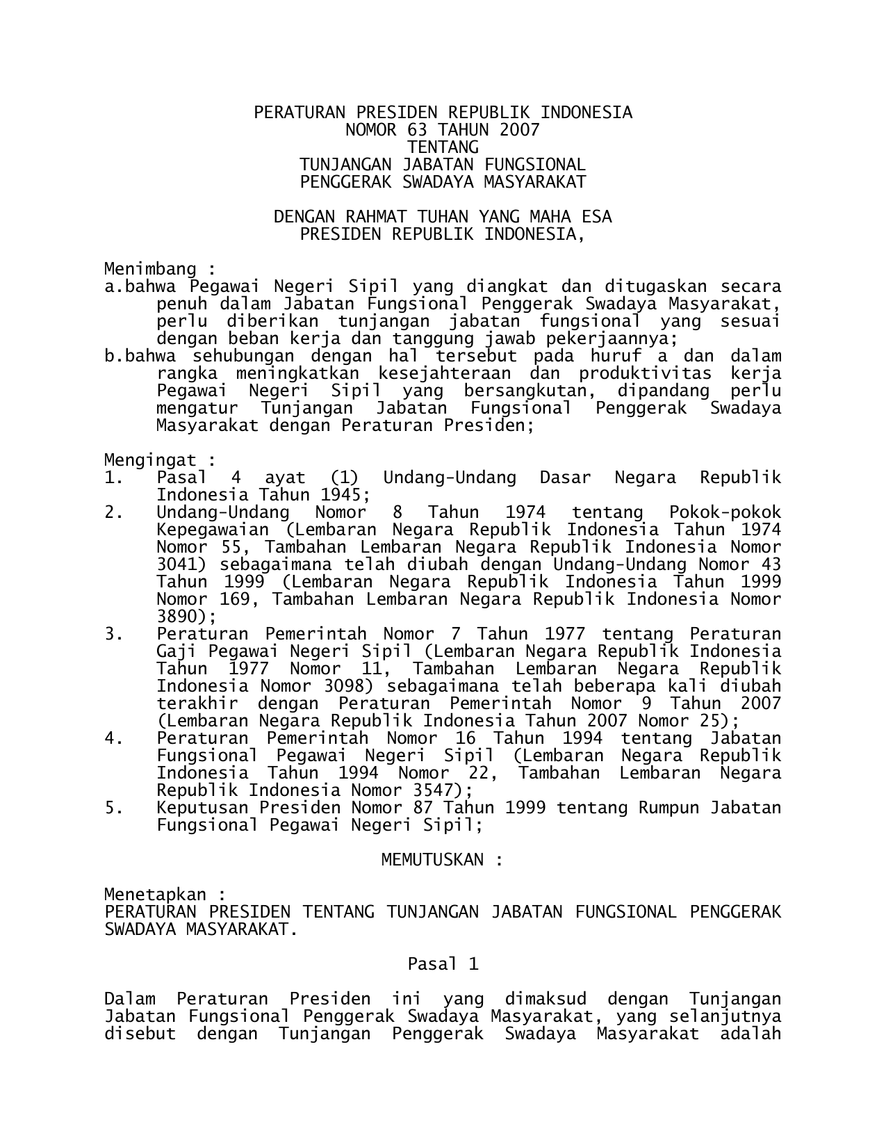 PERPRES Nomor 63 Tahun 2007 | Peraturan Presiden Nomor 63 Tahun 2007 tentang TUNJANGAN JABATAN FUNGSIONAL PENGGERAK SWADAYA MASYARAKAT