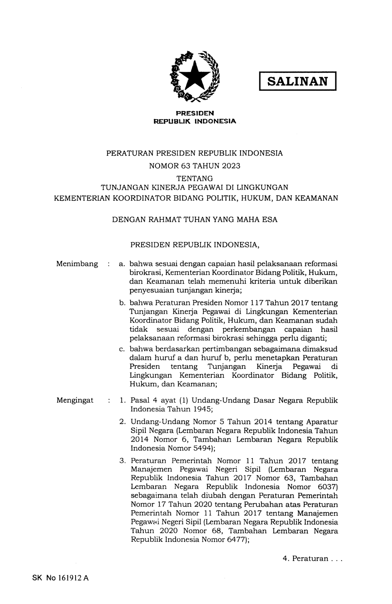 PERPRES Nomor 63 Tahun 2023 | Peraturan Presiden Nomor 63 Tahun 2023 tentang TUNJANGAN KINERJA PEGAWAI DI LINGKUNGAN KEMENTERIAN KOORDINATOR BIDANG POLITIK, HUKUM, DAN KEAMANAN