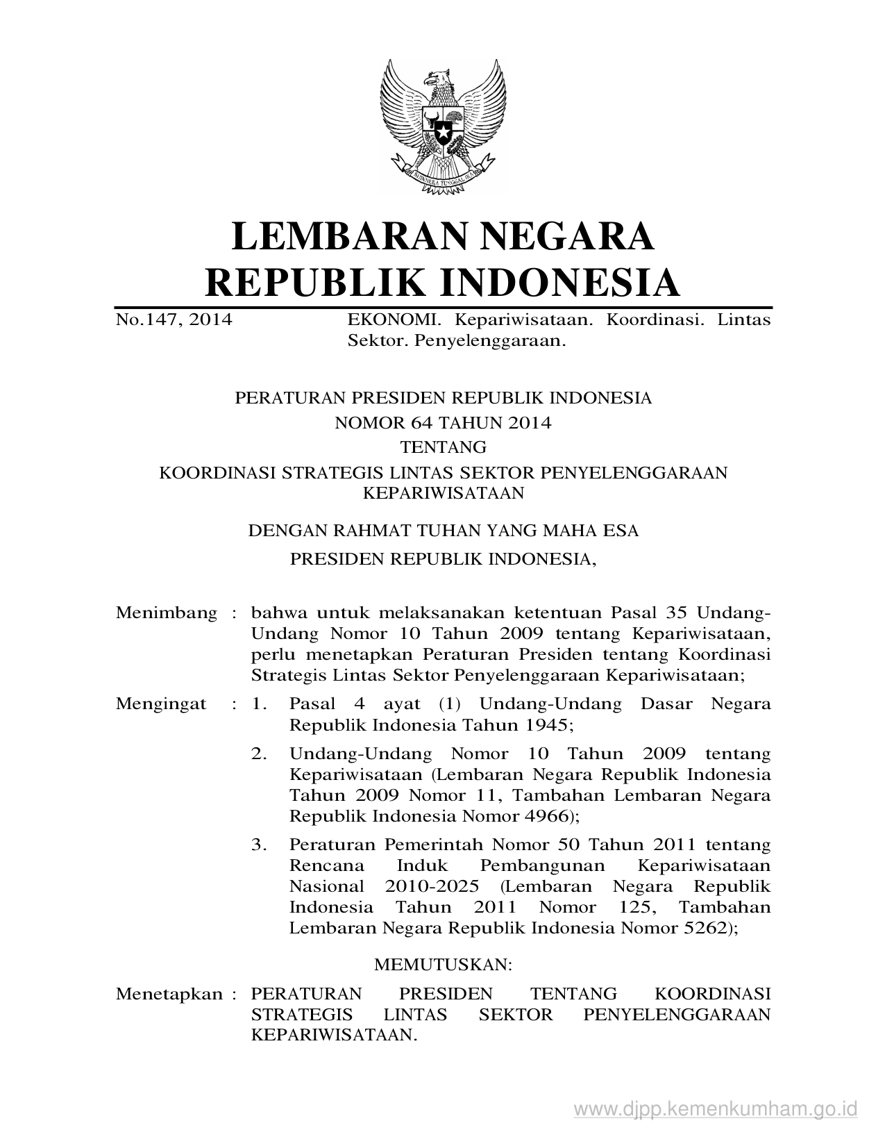 PERPRES Nomor 64 Tahun 2014 | Peraturan Presiden Nomor 64 Tahun 2014 tentang KOORDINASI STRATEGIS LINTAS SEKTOR PENYELENGGARAAN KEPARIWISATAAN