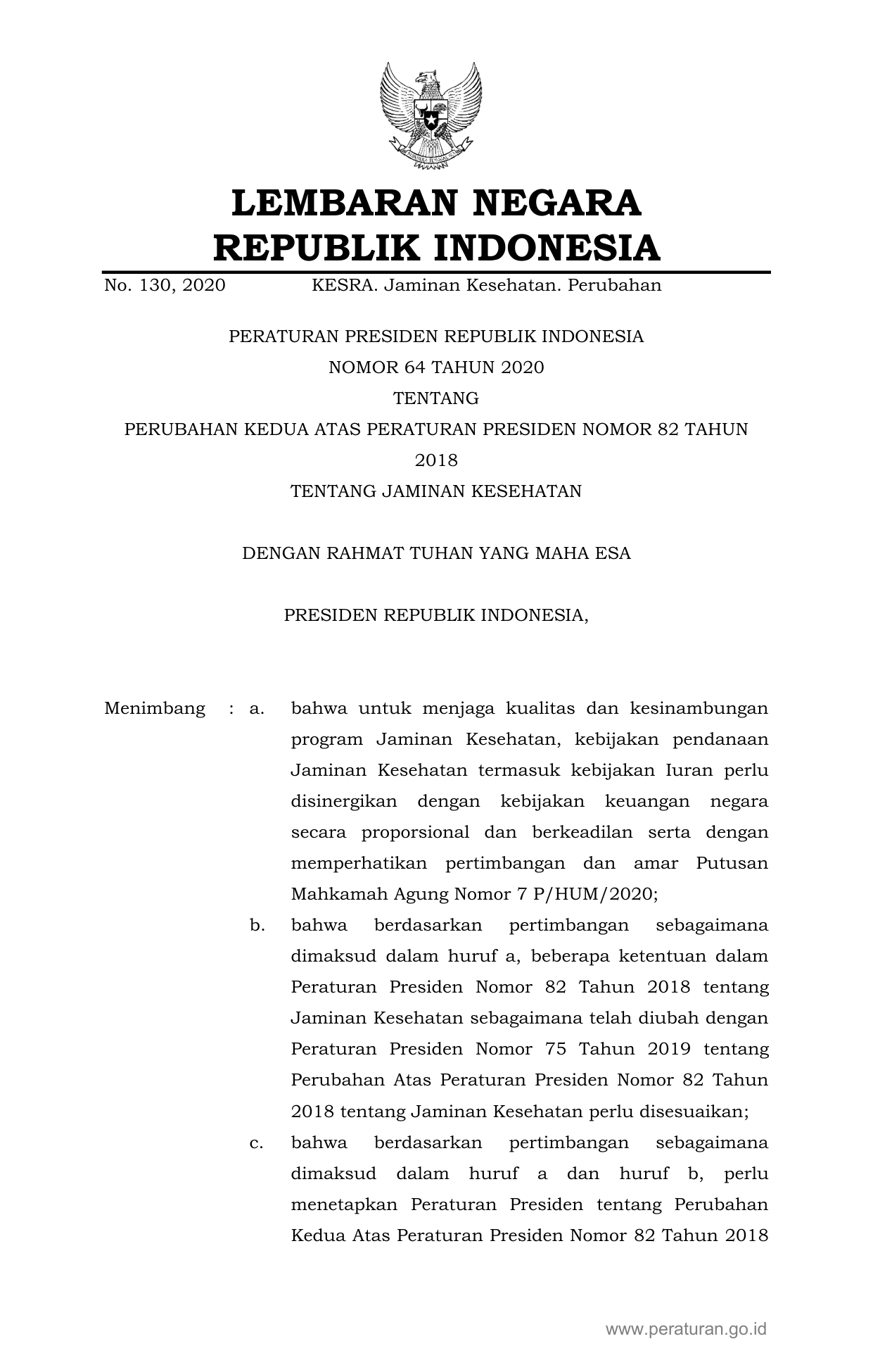 PERPRES Nomor 64 Tahun 2020 | Peraturan Presiden Nomor 64 Tahun 2020 tentang PERUBAHAN KEDUA ATAS PERATURAN PRESIDEN NOMOR 82 TAHUN 2018 TENTANG JAMINAN KESEHATAN