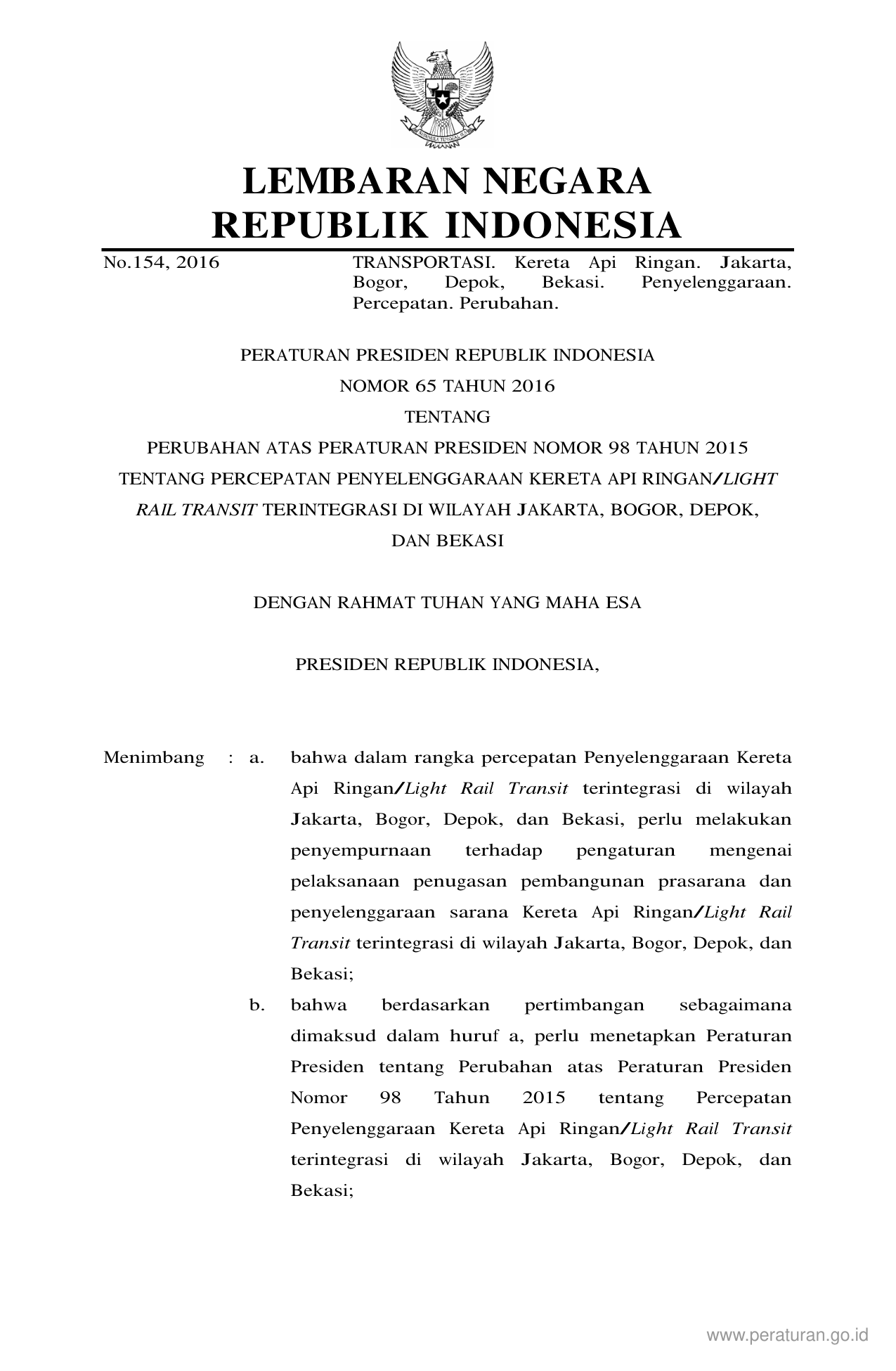 PERPRES Nomor 65 Tahun 2016 | Peraturan Presiden Nomor 65 Tahun 2016 tentang PERUBAHAN ATAS PERATURAN PRESIDEN NOMOR 98 TAHUN 2015 TENTANG PERCEPATAN PENYELENGGARAAN KERETA API RINGANLIGHT RAIL TRANSIT TERINTEGRASI DI WILAYAH JAKARTA BOGOR DEPOK DAN BEKASI