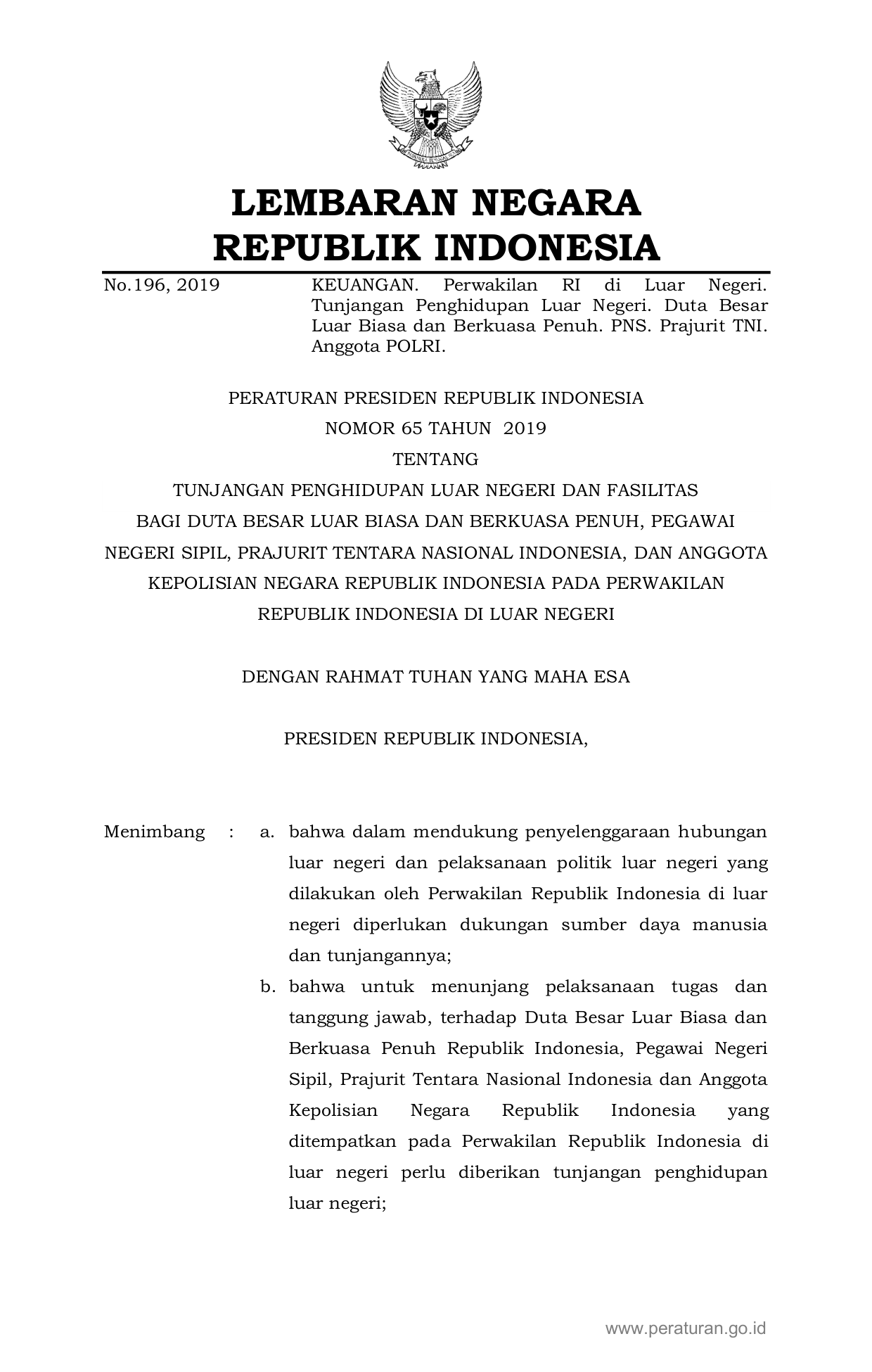 PERPRES Nomor 65 Tahun 2019 | Peraturan Presiden Nomor 65 Tahun 2019 tentang TUNJANGAN PENGHIDUPAN LUAR NEGERI DAN FASILITAS BAGI DUTA BESAR LUAR BIASA DAN BERKUASA PENUH, PEGAWAI NEGERI SIPIL, PRAJURIT TENTARA NASIONAL INDONESIA, DAN ANGGOTA KEPOLISIAN NEGARA REPUBLIK INDONESIA PADA PERWAKILAN REPUBLIK INDONESIA DI LUAR NEGERI