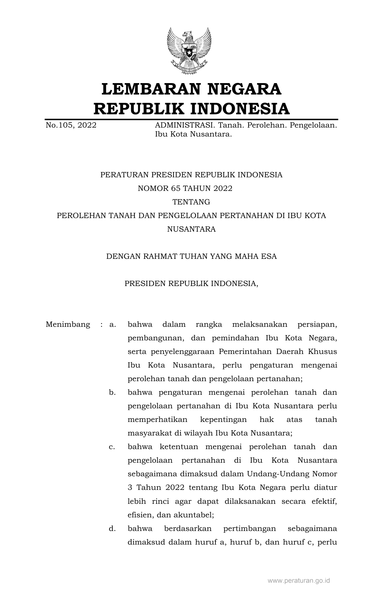 PERPRES Nomor 65 Tahun 2022 | Peraturan Presiden Nomor 65 Tahun 2022 tentang PEROLEHAN TANAH DAN PENGELOLAAN PERTANAHAN DI IBU KOTA NUSANTARA