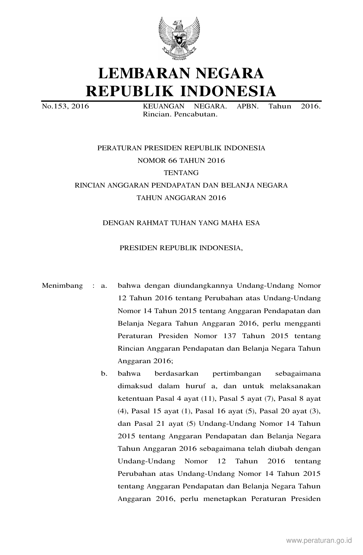 PERPRES Nomor 66 Tahun 2016 | Peraturan Presiden Nomor 66 Tahun 2016 tentang RINCIAN ANGGARAN PENDAPATAN DAN BELANJA NEGARA TAHUN ANGGARAN 2016