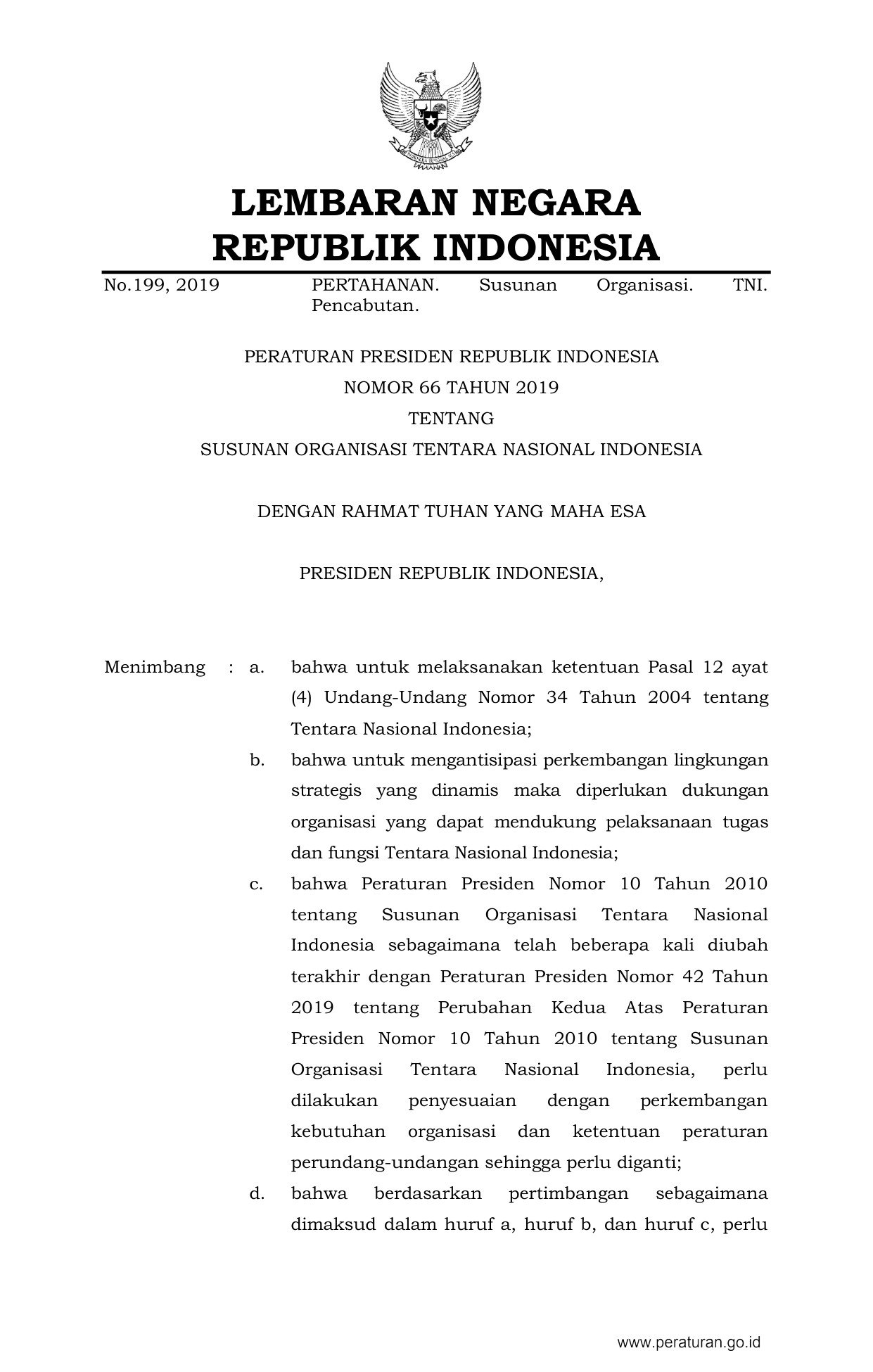 PERPRES Nomor 66 Tahun 2019 | Peraturan Presiden Nomor 66 Tahun 2019 tentang SUSUNAN ORGANISASI TENTARA NASIONAL INDONESIA