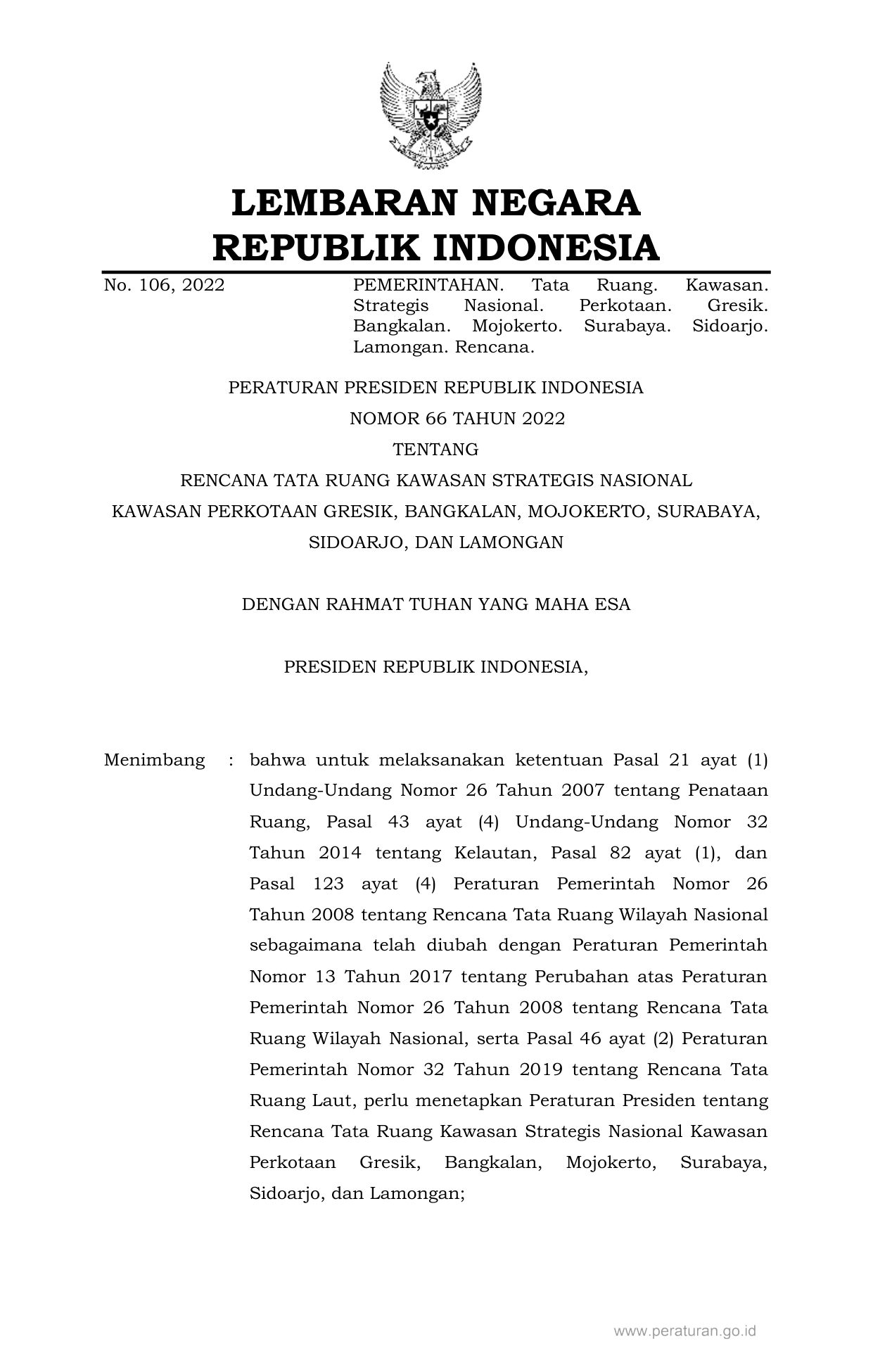 PERPRES Nomor 66 Tahun 2022 | Peraturan Presiden Nomor 66 Tahun 2022 tentang RENCANA TATA RUANG KAWASAN STRATEGIS NASIONAL KAWASAN PERKOTAAN GRESIK, BANGKALAN, MOJOKERTO, SURABAYA, SIDOARJO, DAN LAMONGAN