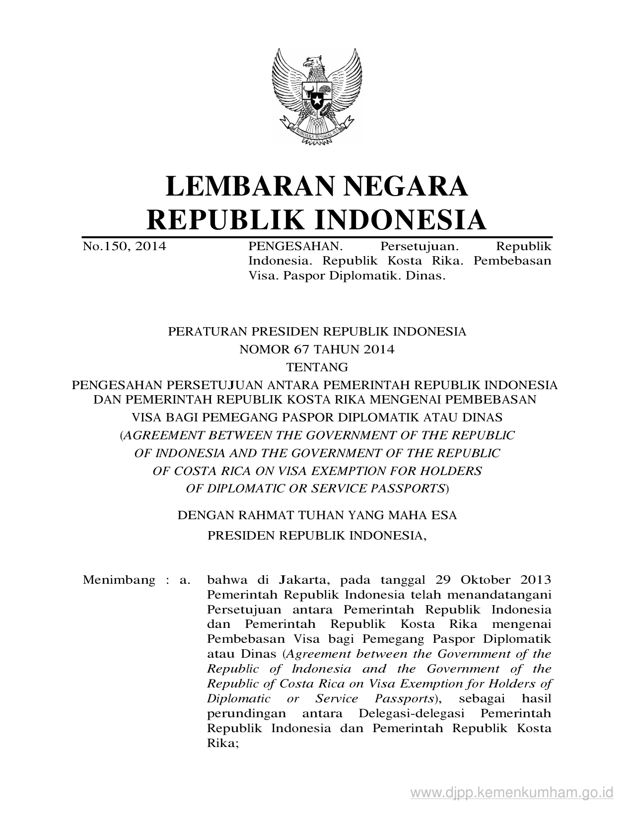 PERPRES Nomor 67 Tahun 2014 | Peraturan Presiden Nomor 67 Tahun 2014 tentang PENGESAHAN PERSETUJUAN ANTARA PEMERINTAH REPUBLIK INDONESIA DAN PEMERINTAH REPUBLIK KOSTA RIKA MENGENAI PEMBEBASAN VISA BAGI PEMEGANG PASPOR DIPLOMATIK ATAU DINAS (AGREEMENT BETWEEN THE GOVERNMENT OF THE REPUBLIC OF INDONESIA AND THE GOVERNMENT OF THE REP