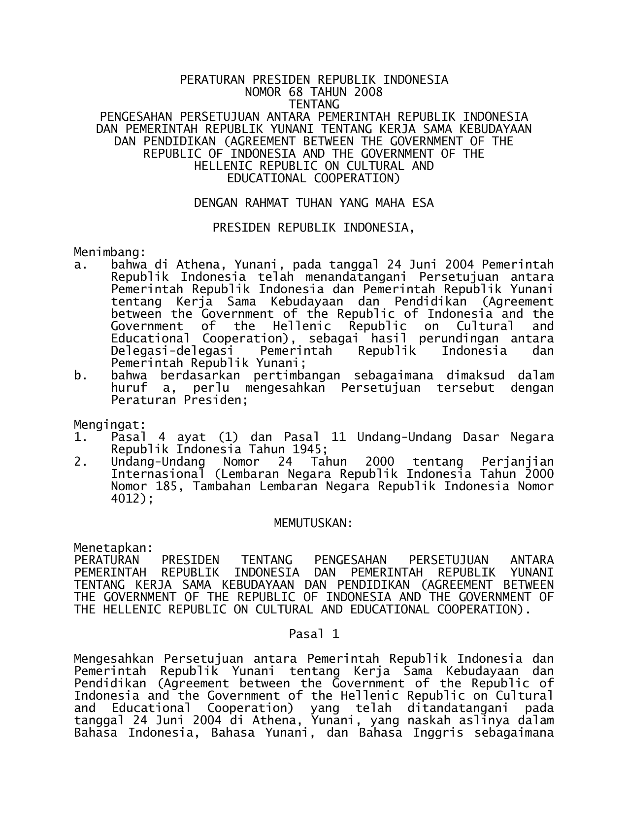 PERPRES Nomor 68 Tahun 2008 | Peraturan Presiden Nomor 68 Tahun 2008 tentang PENGESAHAN PERSETUJUAN ANTARA PEMERINTAH RI DAN PEMERINTAH REPUBLIK YUNANI TENTANG KERJA SAMA KEBUDAYAAN DAN PENDIDIKAN (AGREEMENT BETWEEN THE GOVERNMENT OF THE REPUBLIC OF INDONESIA AND THE GOVERNMENT OF THE HELLENIC REPUBLIC ON CULTURAL AND EDUCATIONAL COOPERATION)
