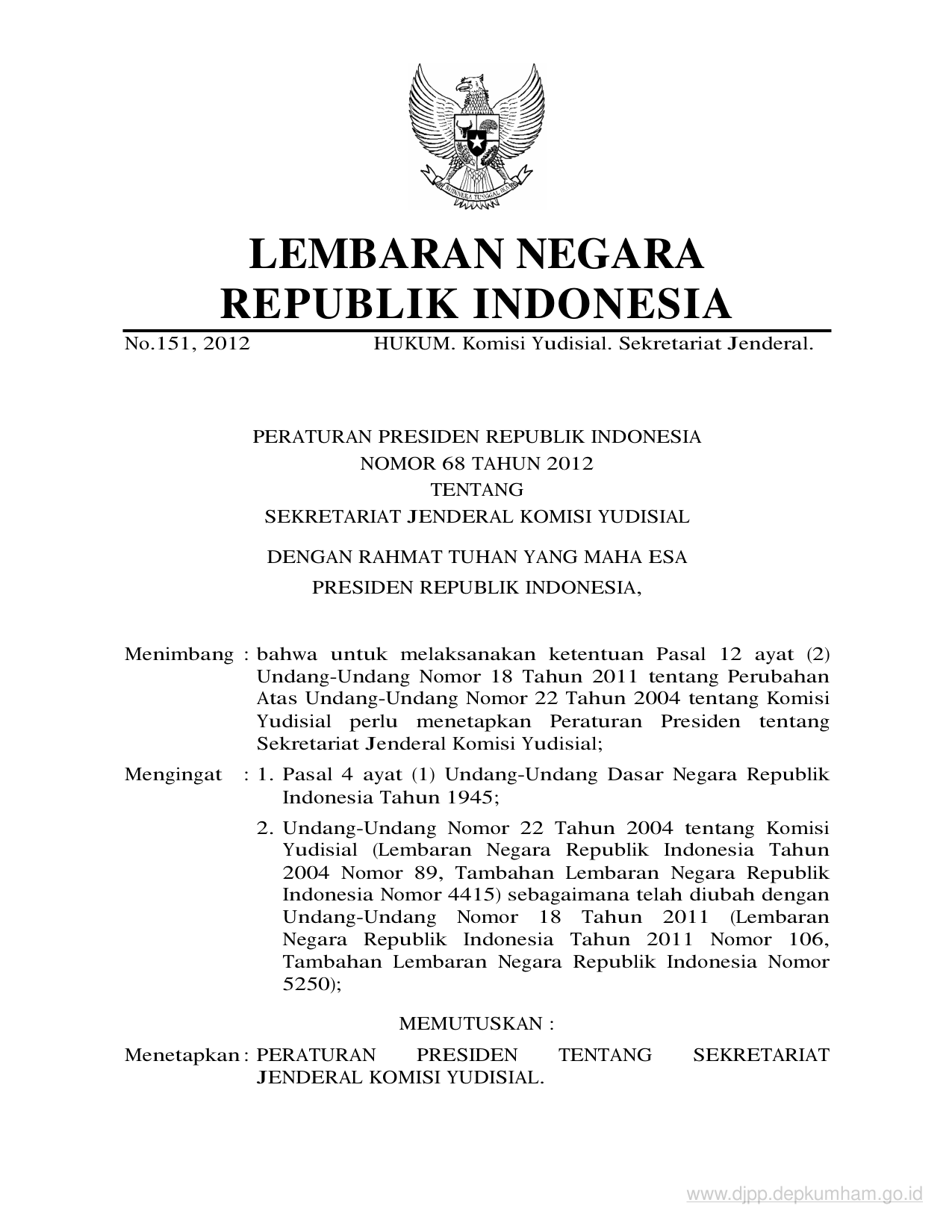 PERPRES Nomor 68 Tahun 2012 | Peraturan Presiden Nomor 68 Tahun 2012 tentang SEKRETARIAT JENDERAL KOMISI YUDISIAL