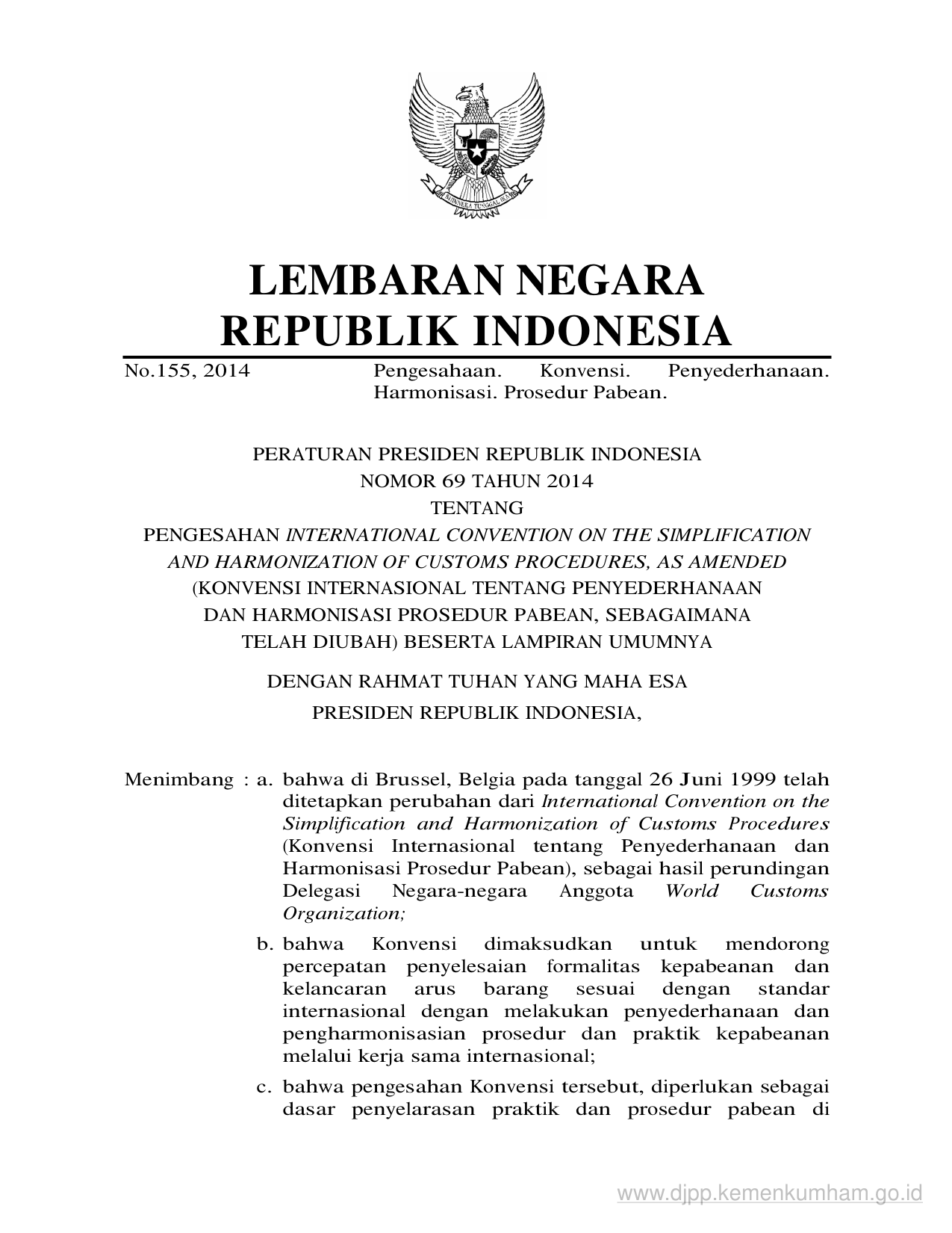 PERPRES Nomor 69 Tahun 2014 | Peraturan Presiden Nomor 69 Tahun 2014 tentang PENGESAHAN INTERNATIONAL CONVENTION ON THE SIMPLIFICATION AND HARMONIZATION OF CUSTOMS PROCEDURES, AS AMENDED (KONVENSI INTERNASIONAL TENTANG PENYEDERHANAAN DAN HARMONISASI PROSEDUR PABEAN, SEBAGAIMANA TELAH DIUBAH) BESERTA LAMPIRAN UMUMNYA