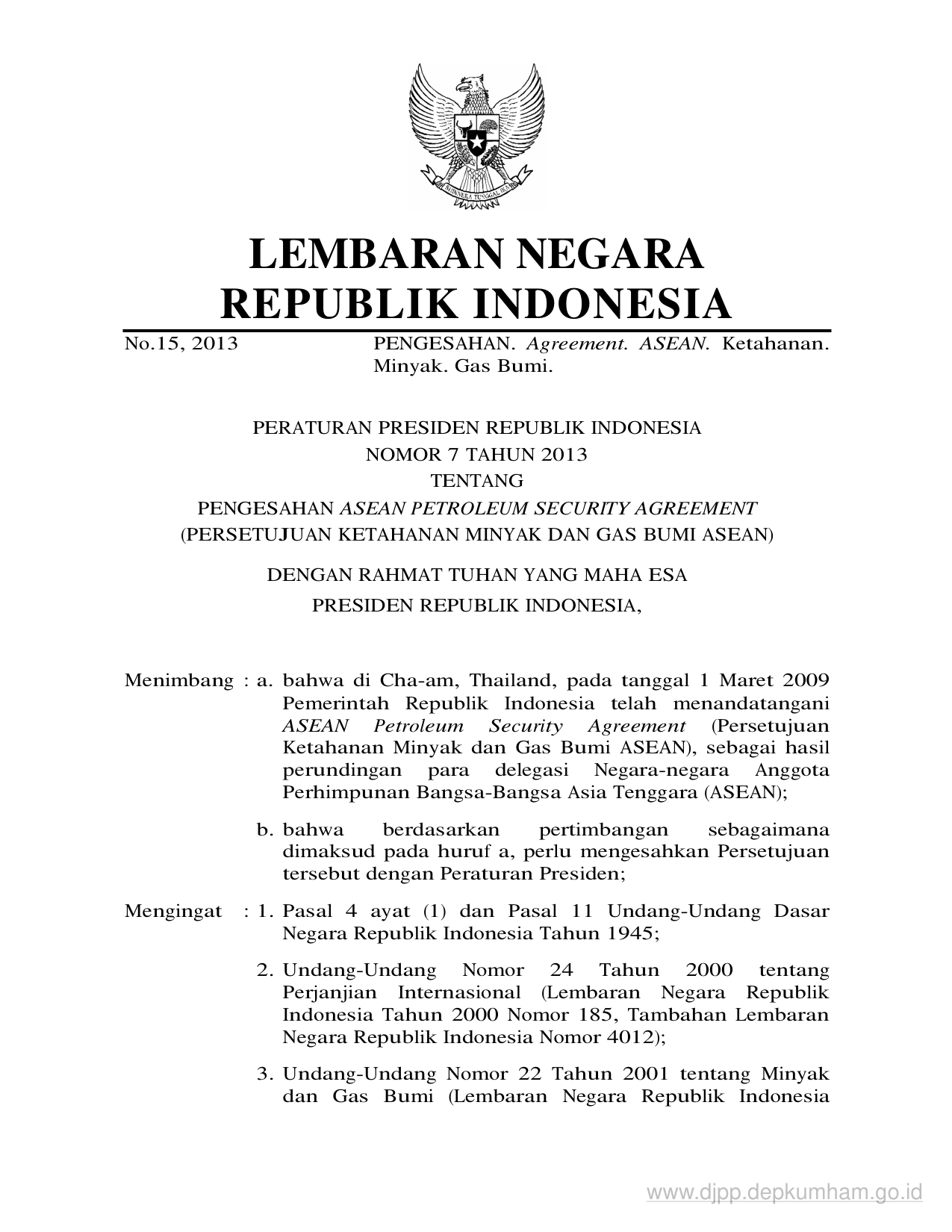 PERPRES Nomor 7 Tahun 2013 | Peraturan Presiden Nomor 7 Tahun 2013 tentang PENGESAHAN ASEAN PETROLEUM SECURITY AGREEMENT (PERSETUJUAN KETAHANAN MINYAK DAN GAS BUMI ASEAN)