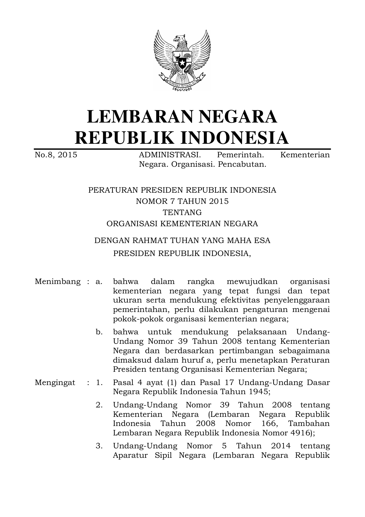 PERPRES Nomor 7 Tahun 2015 | Peraturan Presiden Nomor 7 Tahun 2015 tentang ORGANISASI KEMENTERIAN NEGARA