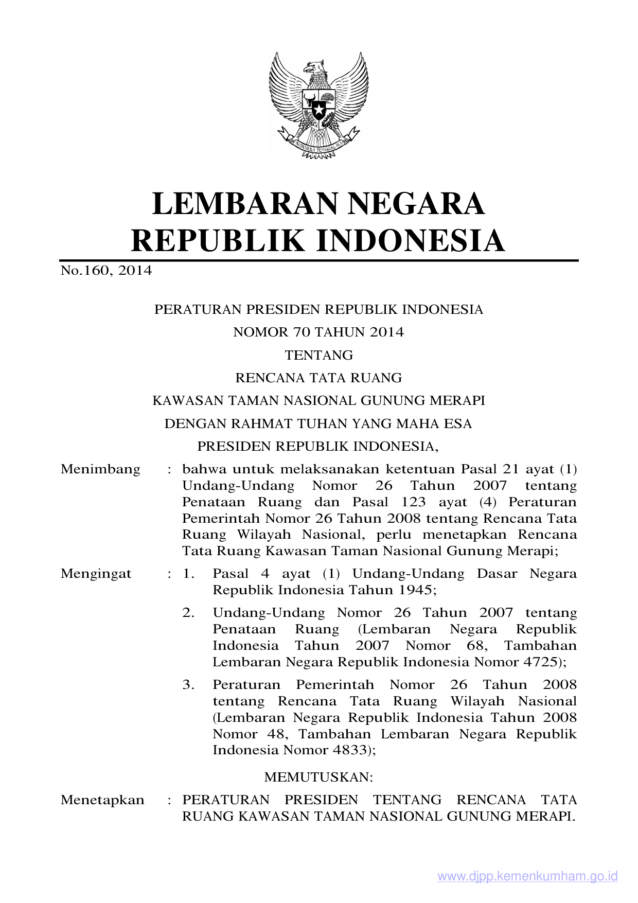 PERPRES Nomor 70 Tahun 2014 | Peraturan Presiden Nomor 70 Tahun 2014 tentang RENCANA TATA RUANG KAWASAN TAMAN NASIONAL GUNUNG MERAPI