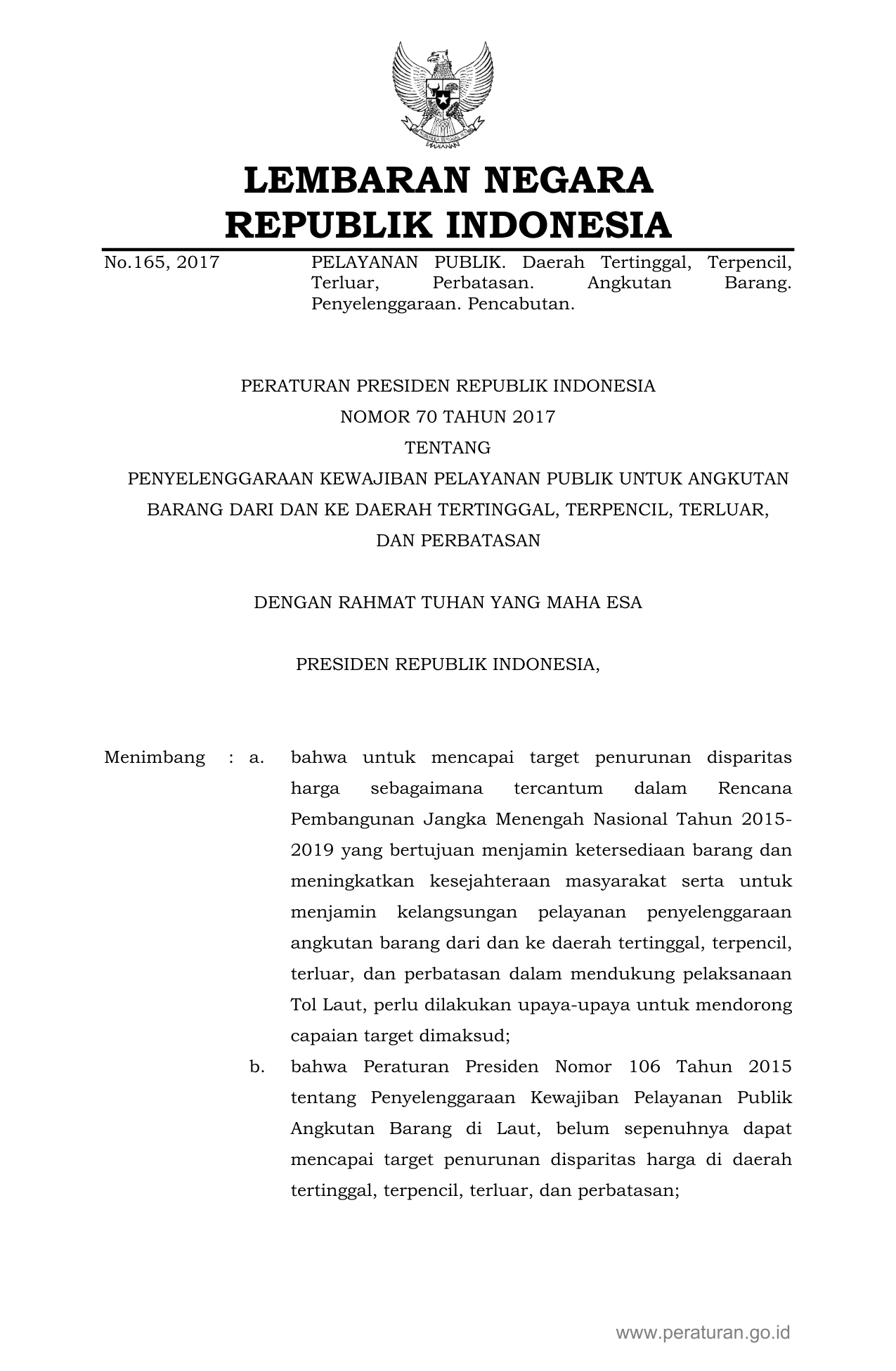 PERPRES Nomor 70 Tahun 2017 | Peraturan Presiden Nomor 70 Tahun 2017 tentang Penyelenggaraan Kewajiban Pelayanan Publik untuk Angkutan Barang dari dan ke Daerah Tertinggal, Terpencil, Terluar, dan Perbatasan
