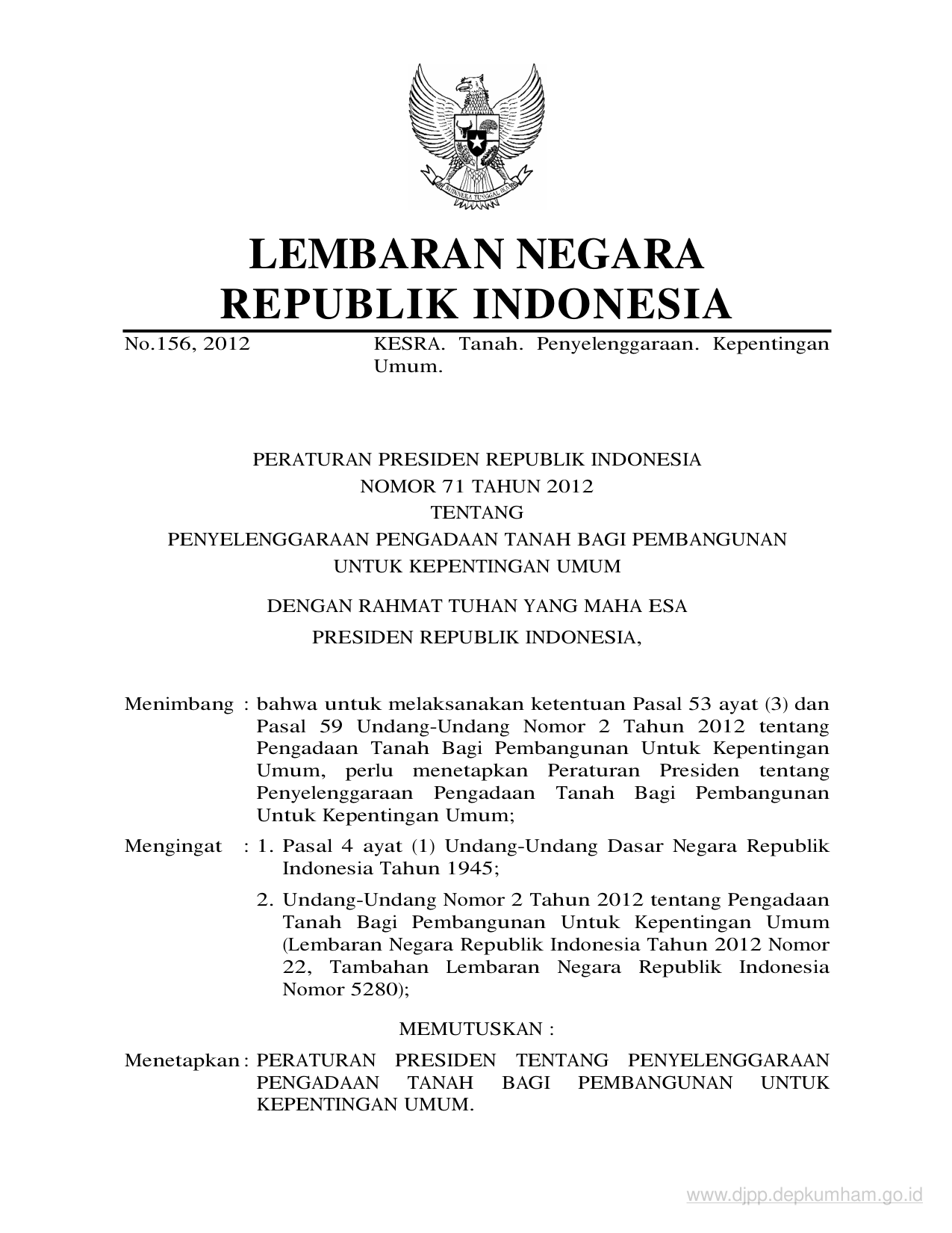PERPRES Nomor 71 Tahun 2012 | Peraturan Presiden Nomor 71 Tahun 2012 tentang PENYELENGGARAAN PENGADAAN TANAH BAGI PEMBANGUNAN UNTUK KEPENTINGAN UMUM
