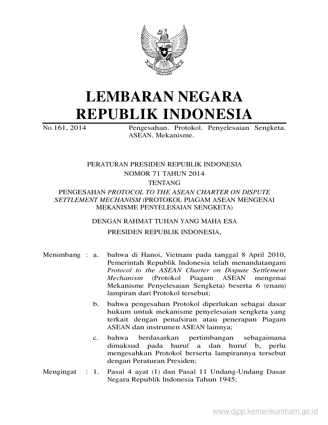 PERPRES Nomor 71 Tahun 2014 | Peraturan Presiden Nomor 71 Tahun 2014 tentang PENGESAHAN PROTOCOL TO THE ASEAN CHARTER ON DISPUTE SETTLEMENT MECHANISM (PROTOKOL PIAGAM ASEAN MENGENAI MEKANISME PENYELESAIAN SENGKETA)
