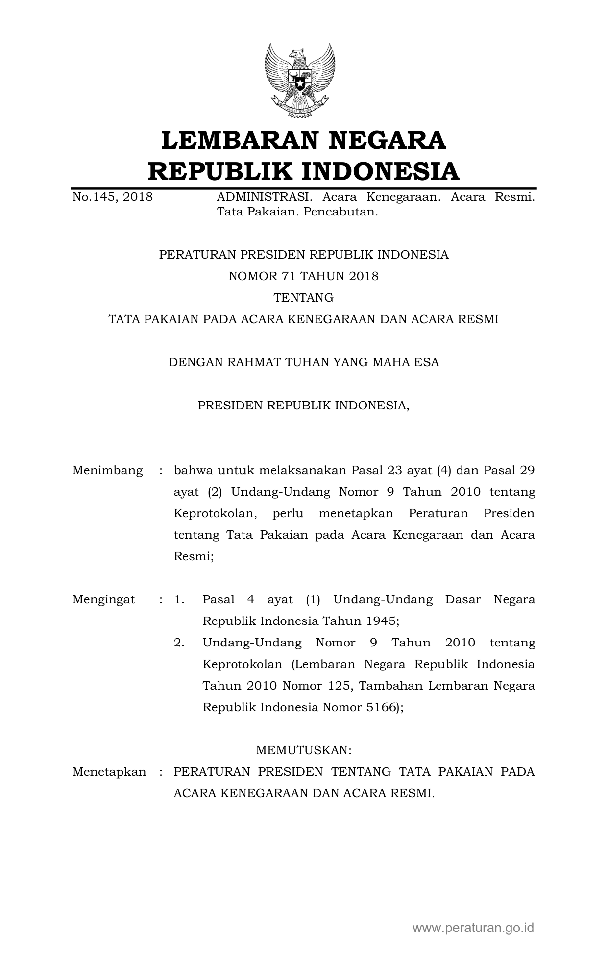 PERPRES Nomor 71 Tahun 2018 | Peraturan Presiden Nomor 71 Tahun 2018 tentang Tata Pakaian Pada Acara Kenegaraan dan Acara Resmi