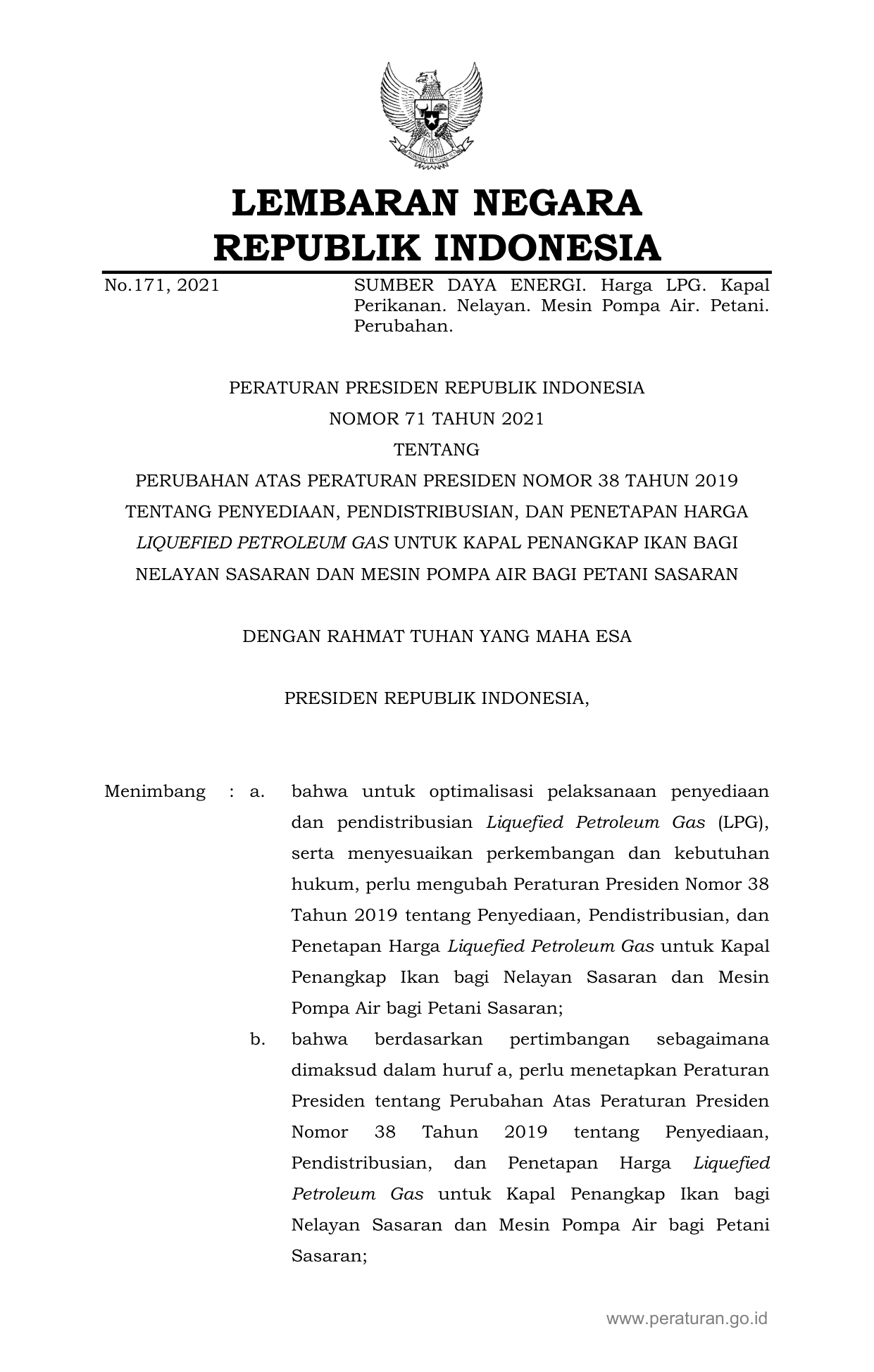 PERPRES Nomor 71 Tahun 2021 | Peraturan Presiden Nomor 71 Tahun 2021 tentang PERUBAHAN ATAS PERATURAN PRESIDEN NOMOR 38 TAHUN 2019 TENTANG PENYEDIAAN, PENDISTRIBUSIAN, DAN PENETAPAN HARGA LIQUEFIED PETROLEUM GAS UNTUK KAPAL PENANGKAP IKAN BAGI NELAYAN SASARAN DAN MESIN POMPA AIR BAGI PETANI SASARAN