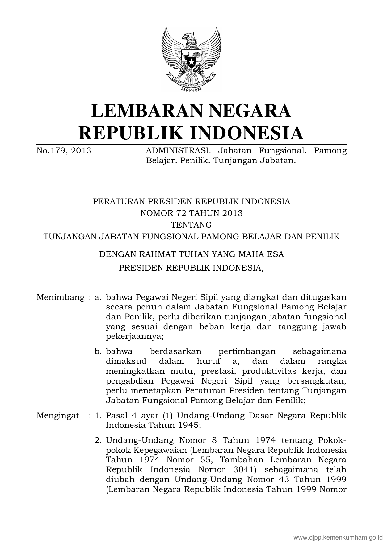 PERPRES Nomor 72 Tahun 2013 | Peraturan Presiden Nomor 72 Tahun 2013 tentang TUNJANGAN JABATAN FUNGSIONAL PAMONG BELAJAR DAN PENILIK