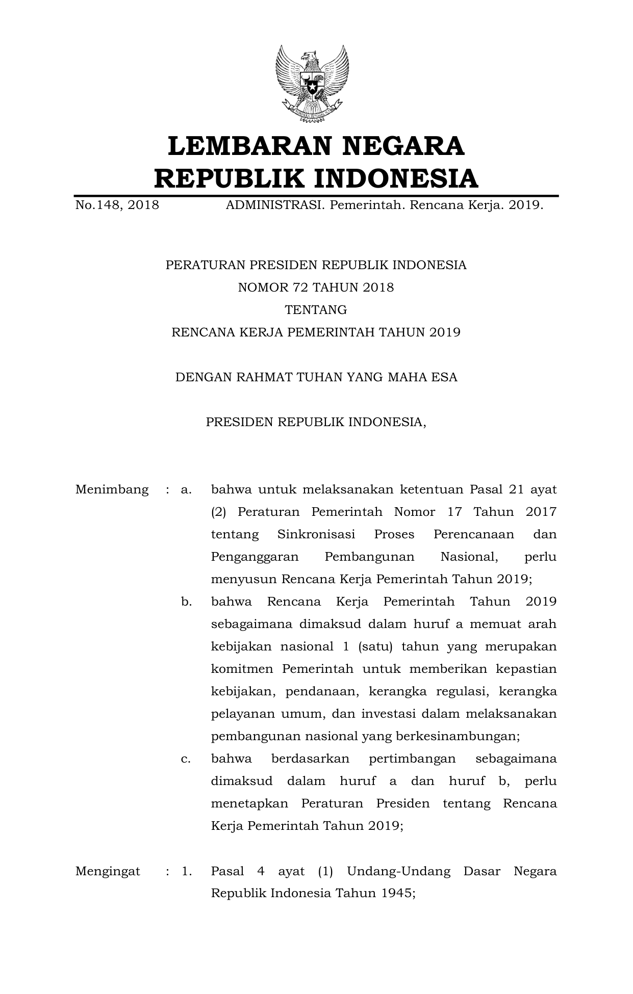 PERPRES Nomor 72 Tahun 2018 | Peraturan Presiden Nomor 72 Tahun 2018 tentang Rencana Kerja Pemerintah Tahun 2019