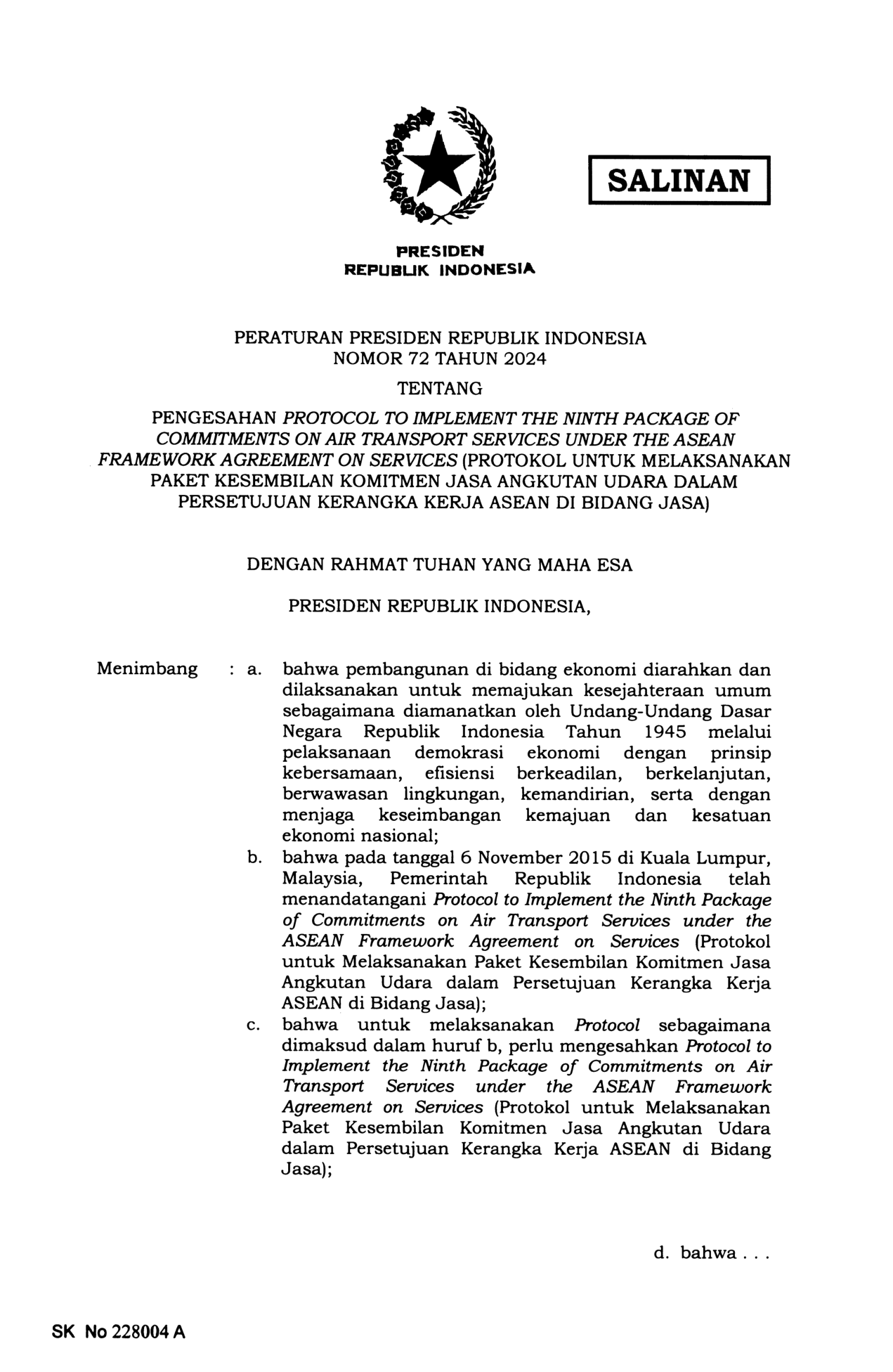 PERPRES Nomor 72 Tahun 2024 | Peraturan Presiden Nomor 72 Tahun 2024 tentang PENGESAHAN PROTOCOL TO IMPLEMENT THE NINTH PACKAGE OF COMMITMENTS ON AIR TRANSPORT SERVICES UNDER THE ASEAN FRAMEWORK AGREEMENT ON SERVIES (PROTOKOL UNTUK MELAKSANAKAN PAKET KESEMBILAN KOMITMEN JASA ANGKUTAN UDARA DALAM PERSETUJUAN KERANGKA KERJA ASEAN DI BIDANG JASA)