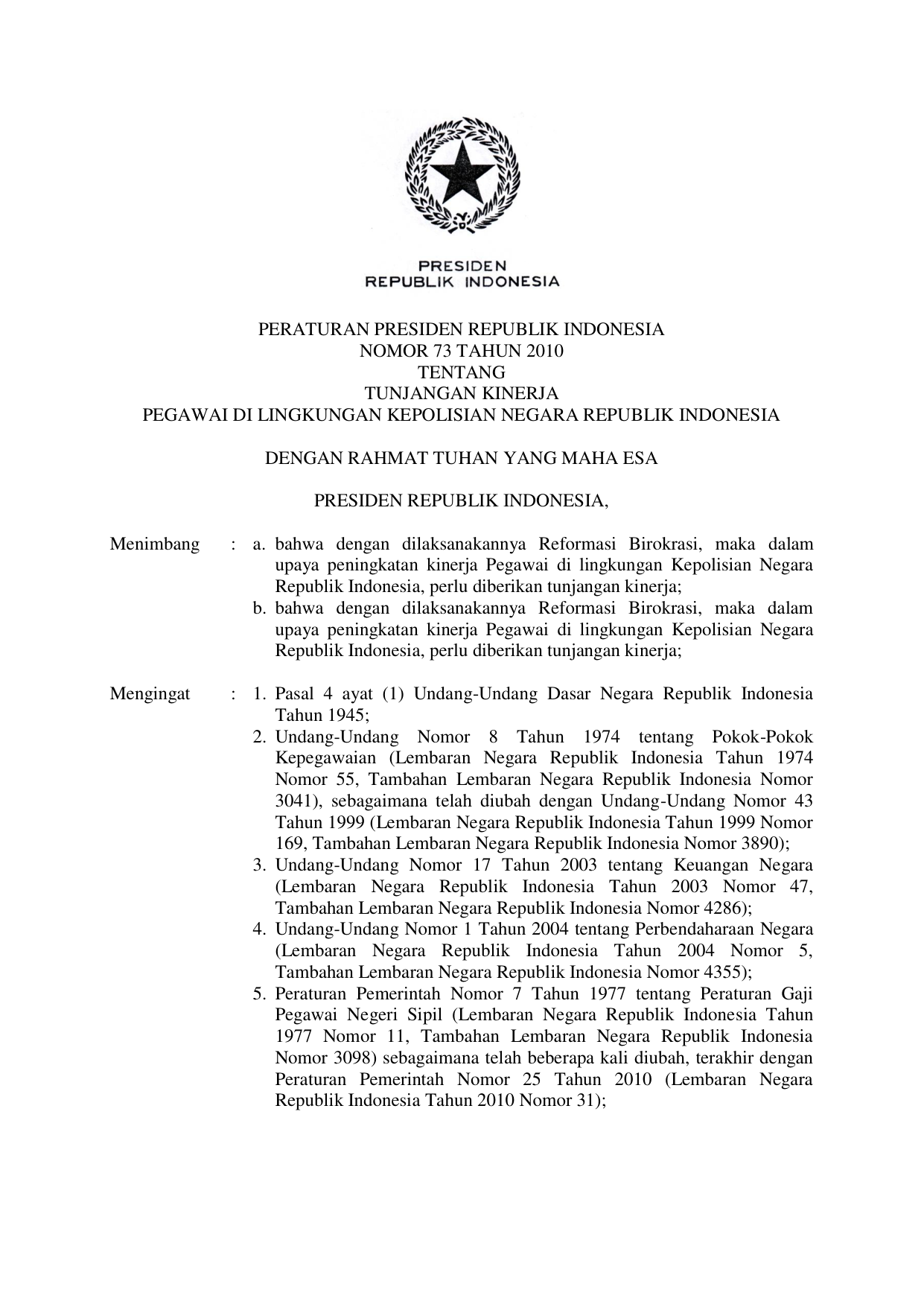 PERPRES Nomor 73 Tahun 2010 | Peraturan Presiden Nomor 73 Tahun 2010 tentang TUNJANGAN KINERJA PEGAWAI DI LINGKUNGAN KEPOLISIAN NEGARA REPUBLIK INDONESIA