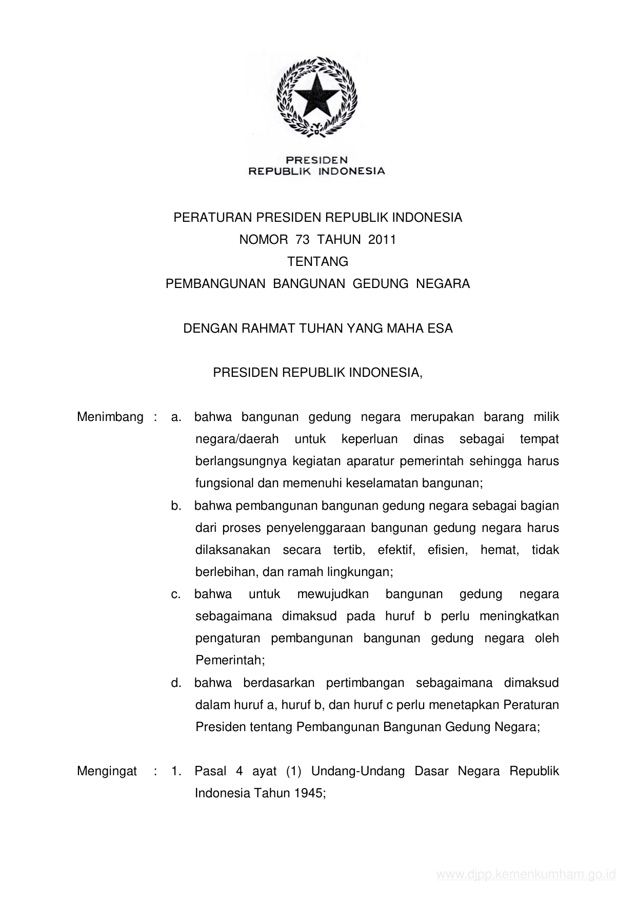 PERPRES Nomor 73 Tahun 2011 | Peraturan Presiden Nomor 73 Tahun 2011 tentang PEMBANGUNAN BANGUNAN GEDUNG NEGARA
