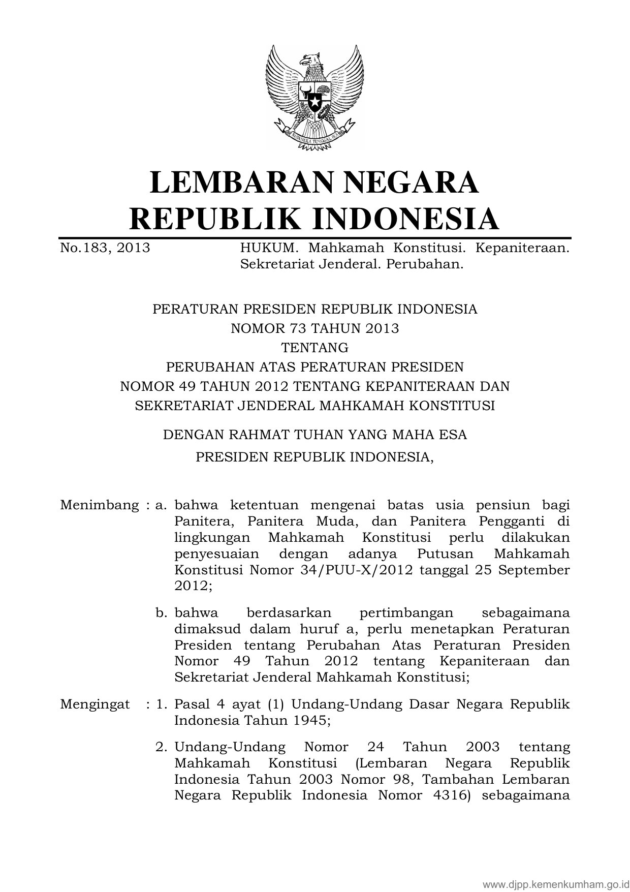 PERPRES Nomor 73 Tahun 2013 | Peraturan Presiden Nomor 73 Tahun 2013 tentang PERUBAHAN ATAS PERATURAN PRESIDEN NOMOR 49 TAHUN 2012 TENTANG KEPANITERAAN DAN SEKRETARIAT JENDERAL MAHKAMAH KONSTITUSI