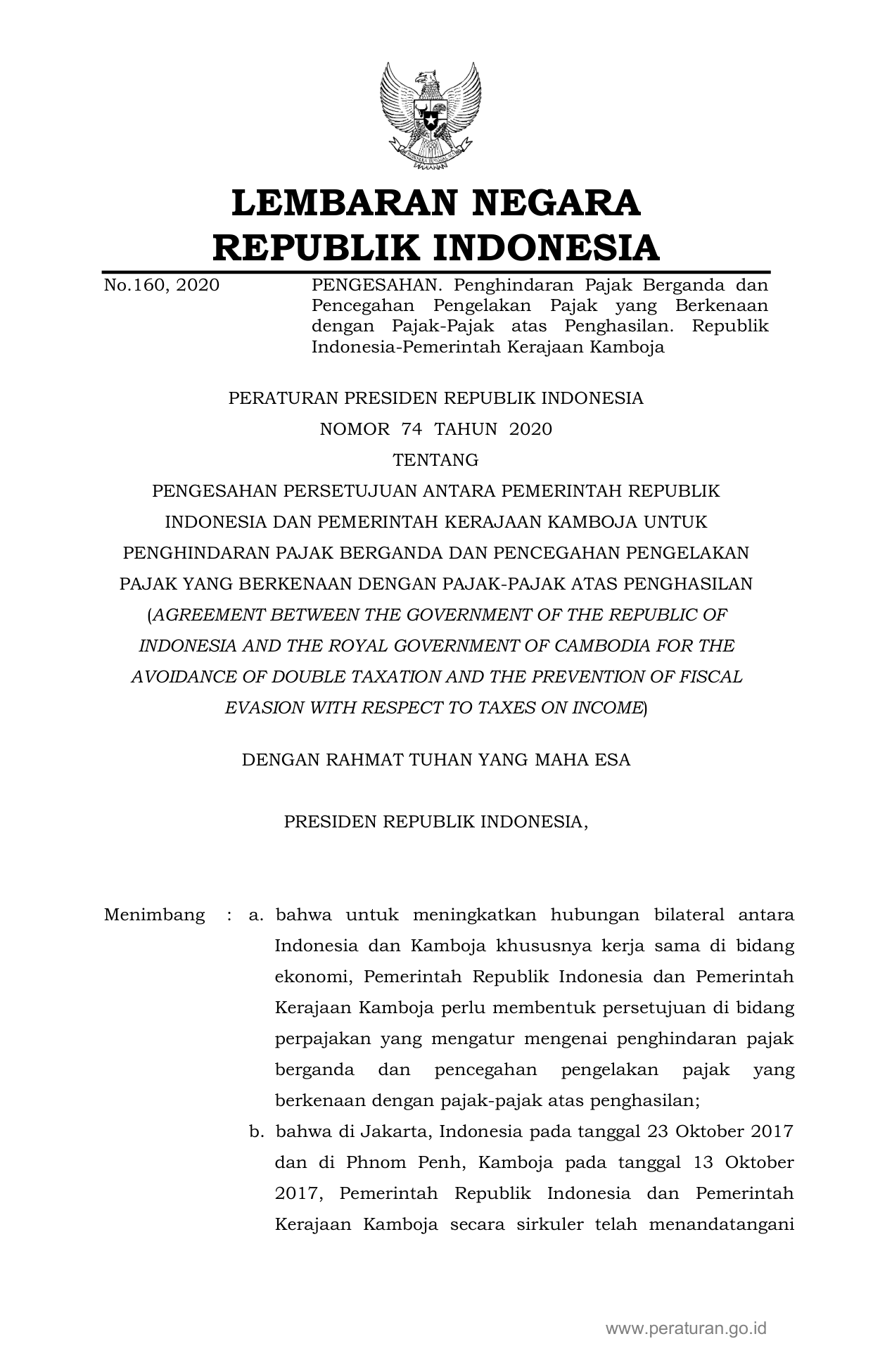 PERPRES Nomor 74 Tahun 2020 | Peraturan Presiden Nomor 74 Tahun 2020 tentang PENGESAHAN PERSETUJUAN ANTARA PEMERINTAH REPUBLIK INDONESIA DAN PEMERINTAH KERAJAAN KAMBOJA UNTUK PENGHINDARAN PAJAK BERGANDA DAN PENCEGAHAN PENGELAKAN PAJAK YANG BERKENAAN DENGAN PAJAK-PAJAK ATAS PENGHASILAN (AGREEMENT BETWEEN THE GOVERNMENT OF THE REPUBLIC OFINDONESIA AND THE ROYAL GOVERNMENT OF CAMBODIA FOR THE AVOIDANCE OF DOUBLE TAXATION AND THE PREVENTION OF FISCAL EVASION WITH RESPECT TO TAXES ON INCOME)