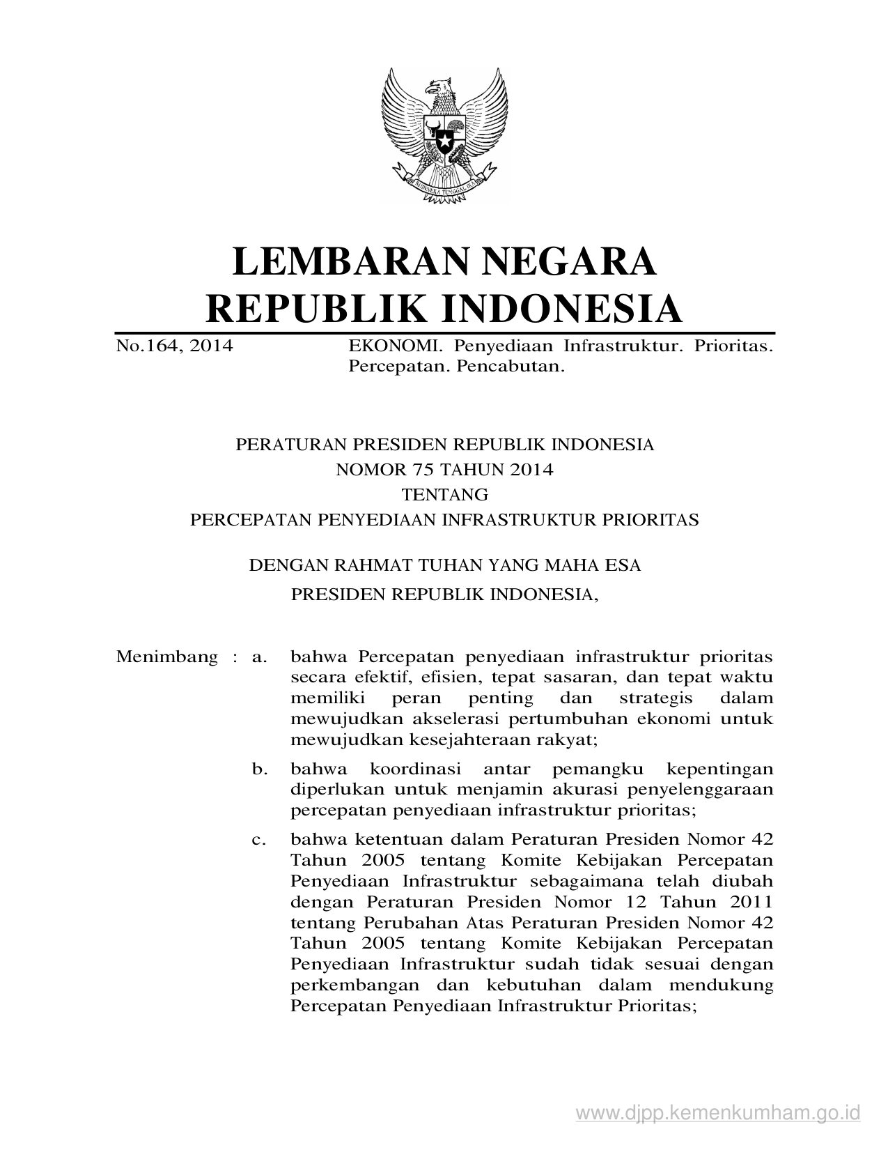 PERPRES Nomor 75 Tahun 2014 | Peraturan Presiden Nomor 75 Tahun 2014 tentang PERCEPATAN PENYEDIAAN INFRASTRUKTUR PRIORITAS