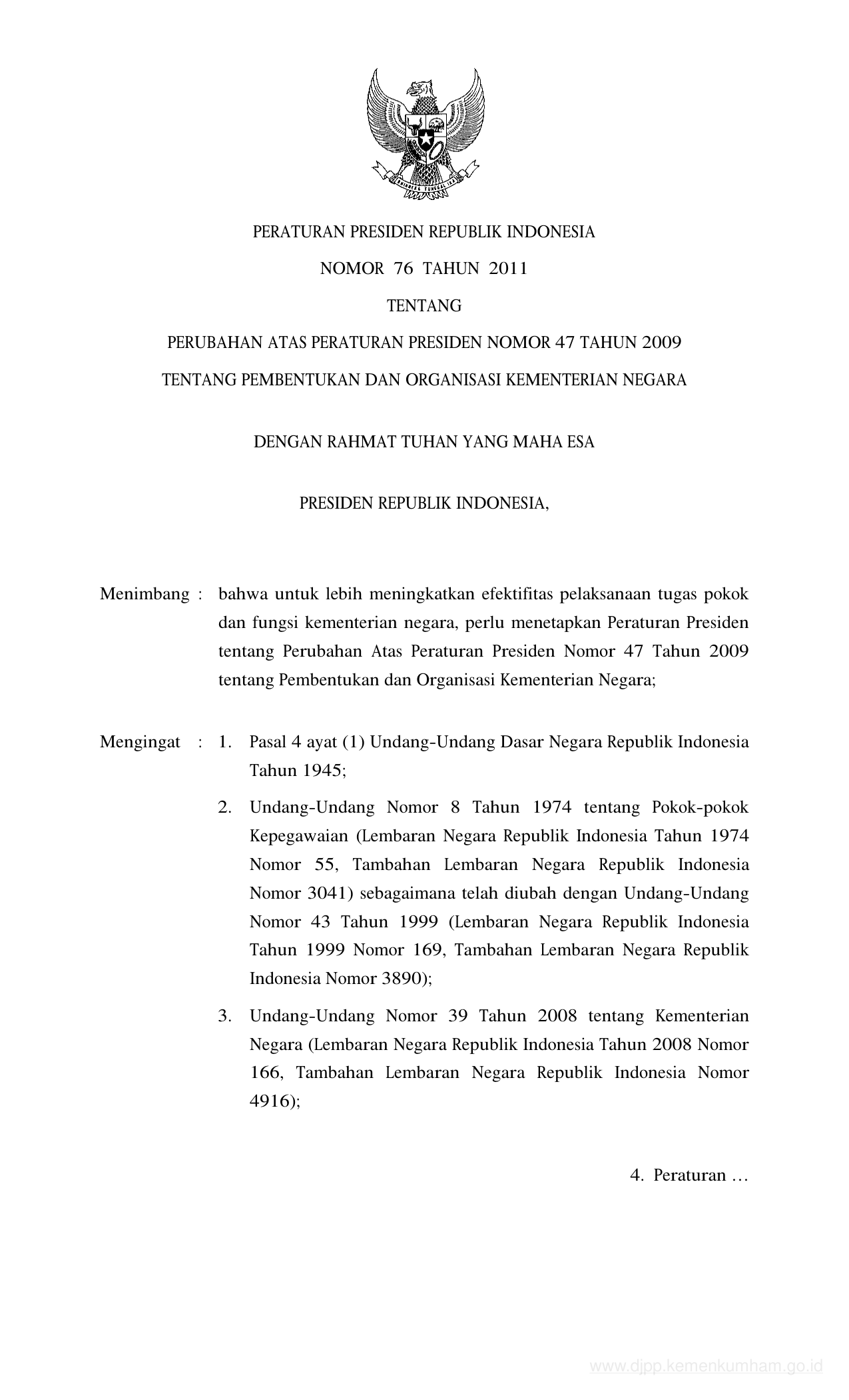 PERPRES Nomor 76 Tahun 2011 | Peraturan Presiden Nomor 76 Tahun 2011 tentang PERUBAHAN ATAS PERATURAN PRESIDEN NOMOR 47 TAHUN 2009 TENTANG PEMBENTUKAN DAN ORGANISASI KEMENTERIAN NEGARA