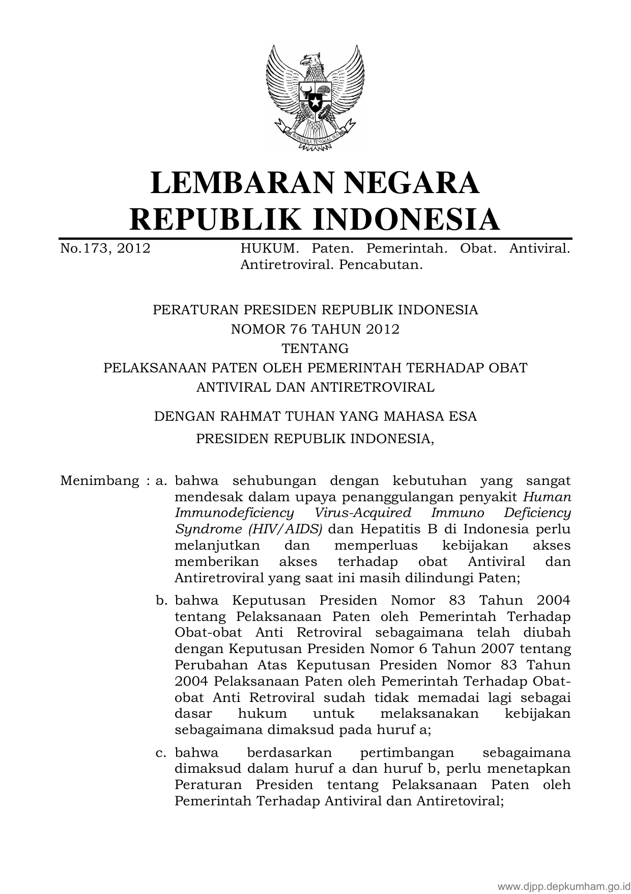 PERPRES Nomor 76 Tahun 2012 | Peraturan Presiden Nomor 76 Tahun 2012 tentang PERATURAN PRESIDEN REPUBLIK INDONESIA NOMOR 76 TAHUN 2012 TENTANG PELAKSANAAN PATEN OLEH PEMERINTAH TERHADAP OBAT ANTIVIRAL DAN ANTIRETROVIRAL