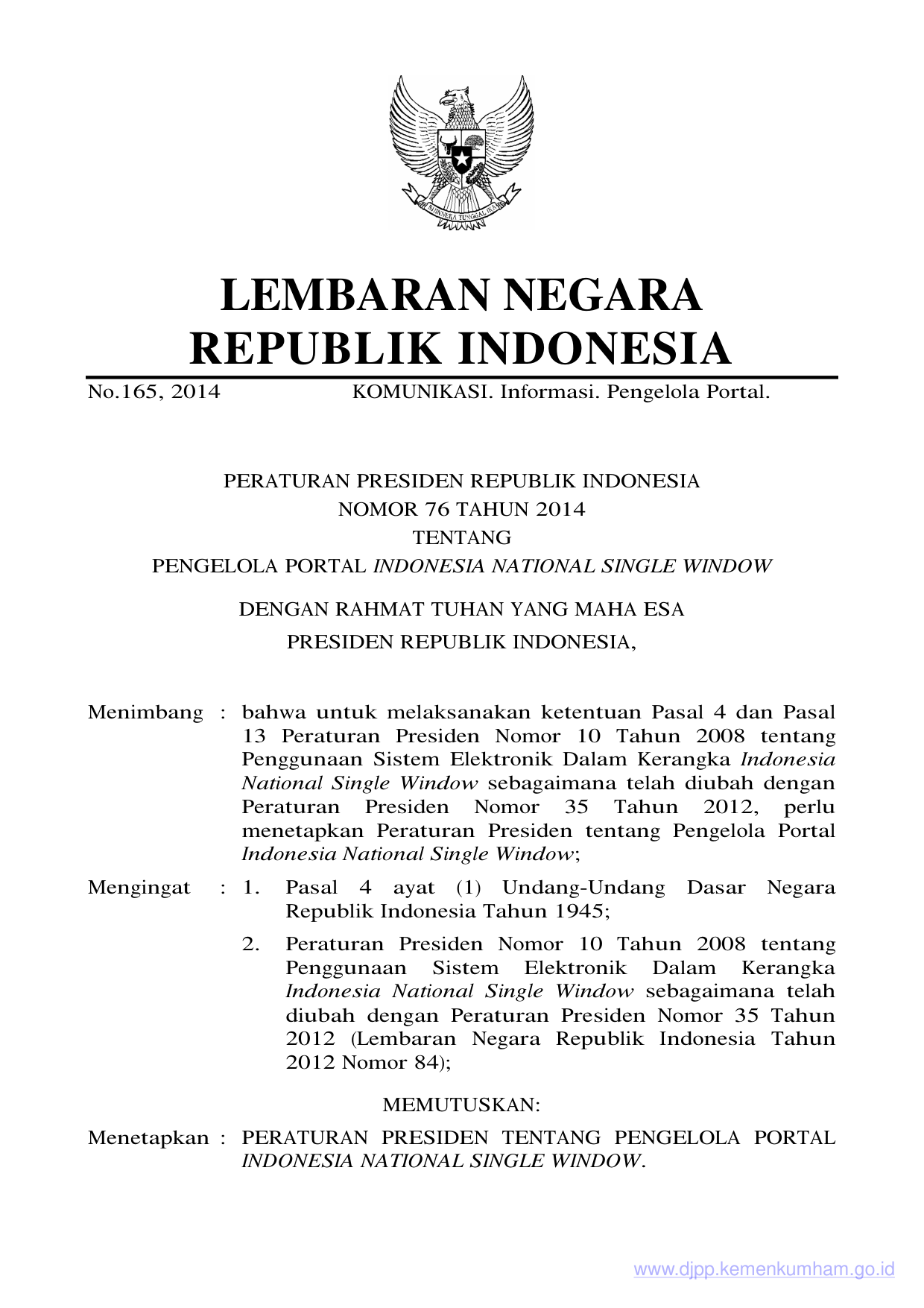 PERPRES Nomor 76 Tahun 2014 | Peraturan Presiden Nomor 76 Tahun 2014 tentang PENGELOLA PORTAL INDONESIA NATIONAL SINGLE WINDOW
