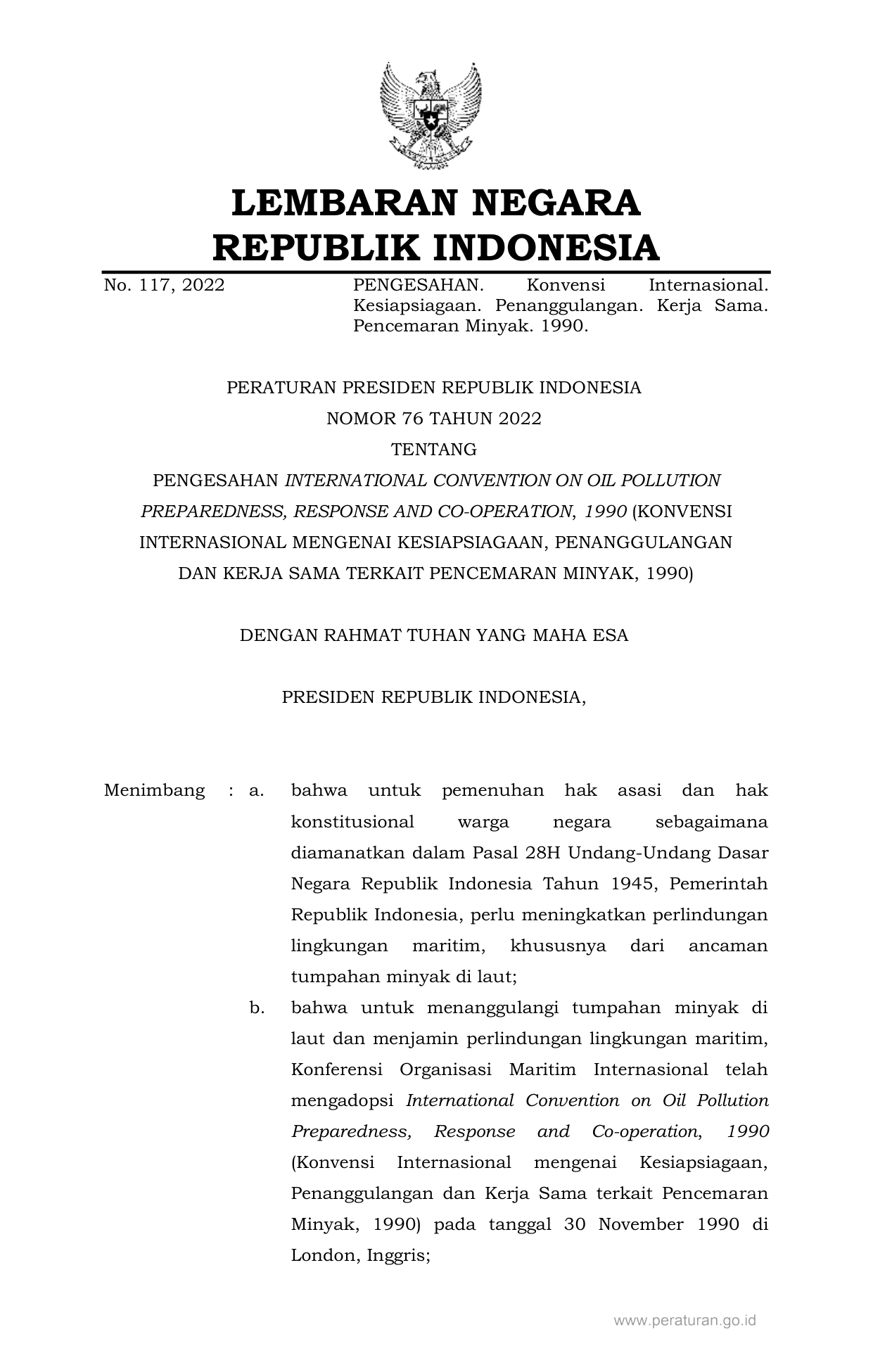 PERPRES Nomor 76 Tahun 2022 | Peraturan Presiden Nomor 76 Tahun 2022 tentang PENGESAHAN INTERNATIONAL CONVENTION ON OIL POLLUTION PREPAREDNESS, RESPONSE AND CO-OPERATION, 1990 (KONVENSI INTERNASIONAL MENGENAI KESIAPSIAGAAN, PENANGGULANGAN DAN KERJA SAMA TERKAIT PENCEMARAN MINYAK, 1990)