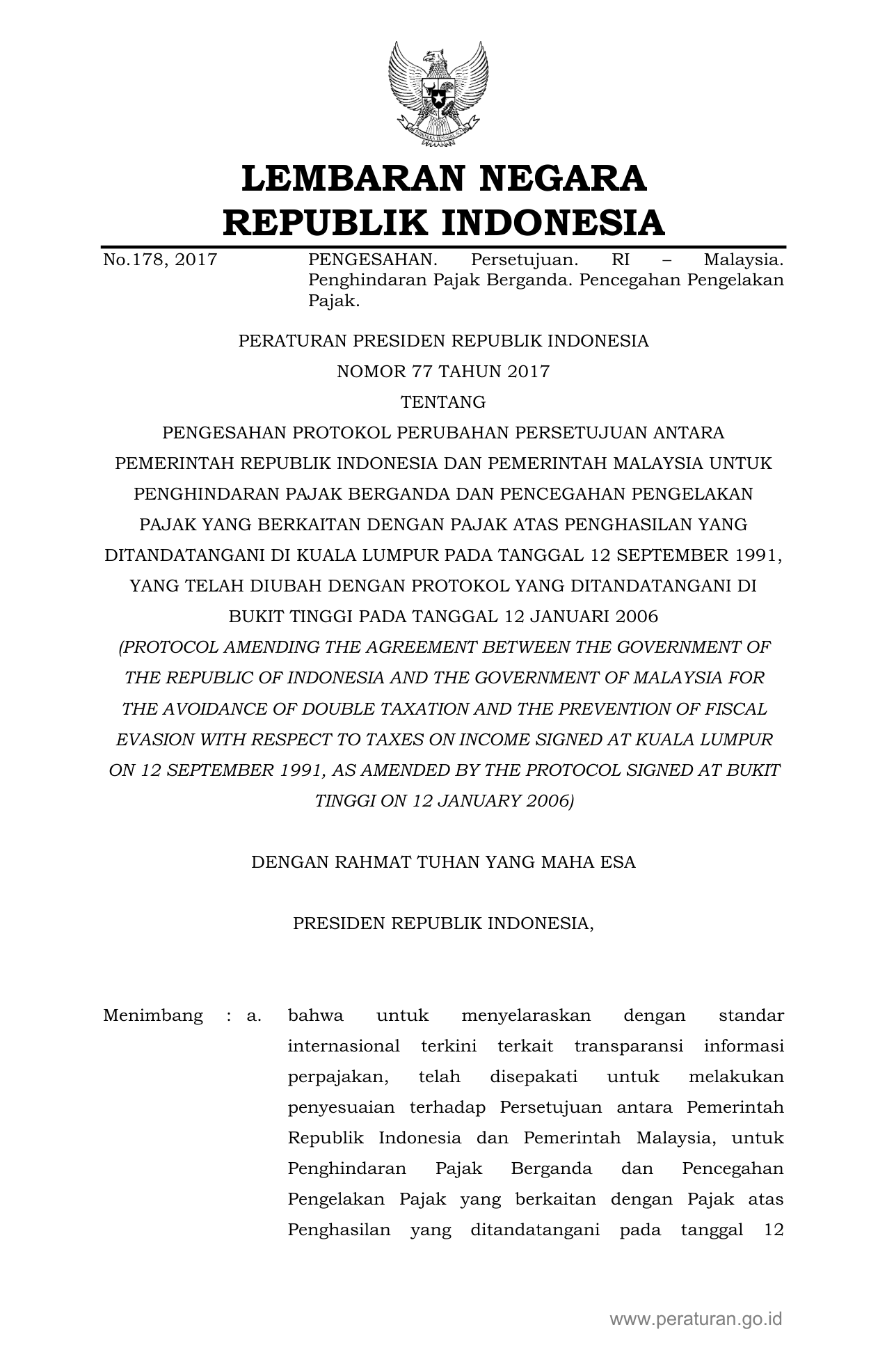 PERPRES Nomor 77 Tahun 2017 | Peraturan Presiden Nomor 77 Tahun 2017 tentang Pengesahan Protokol Perubahan Persetujuan Antara Pemerintah Republik Indonesia dan Pemerintah Malaysia Untuk Penghindaran Pajak Berganda dan Pencegahan Pengelakan Pajak yang Berkaitan dengan Pajak Atas Penghasilan yang Ditandatangani di Kuala Lumpur Pada Tanggal 12 September 1991, yang Telah Diubah dengan Protokol Yang Ditandatangani di Bukit Tinggi Pada Tanggal 12 Januari 2006 (Protocol Amending The Agreement Between The Government Of The Republic Of Indonesia And The Government Of Malaysia For The Avoidance Of Double Taxation And The Prevention Of Fiscal Evasion With Respect To Taxes On Income Signed At Kuala Lumpur On 12 September 1991, As Amended By The Protocol Signed At Bukit Tinggi On 12 January 2006)