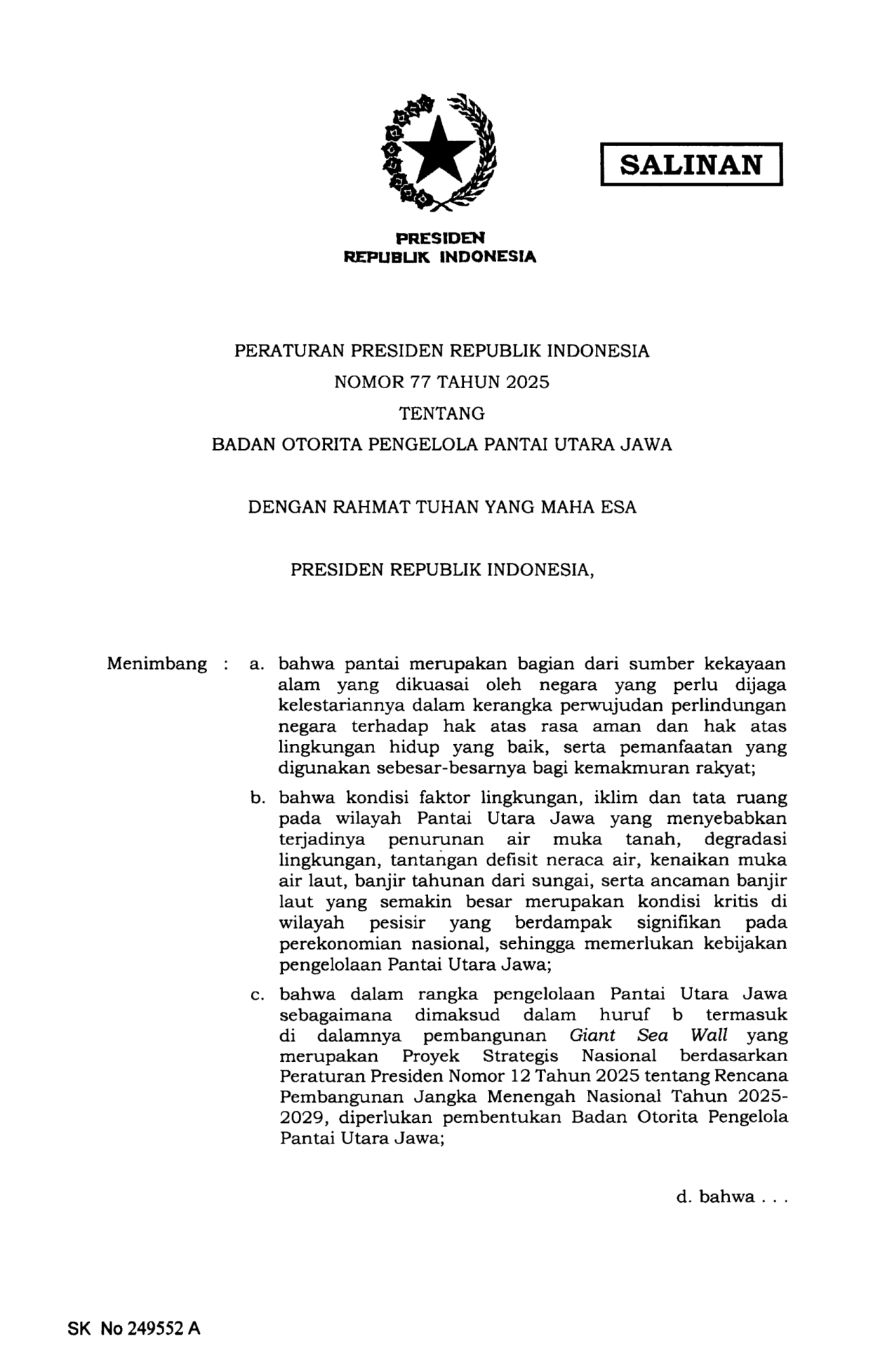 PERPRES Nomor 77 Tahun 2025 | Peraturan Presiden Nomor 77 Tahun 2025 tentang Badan Otorita Pengelola Pantai Utara Jawa