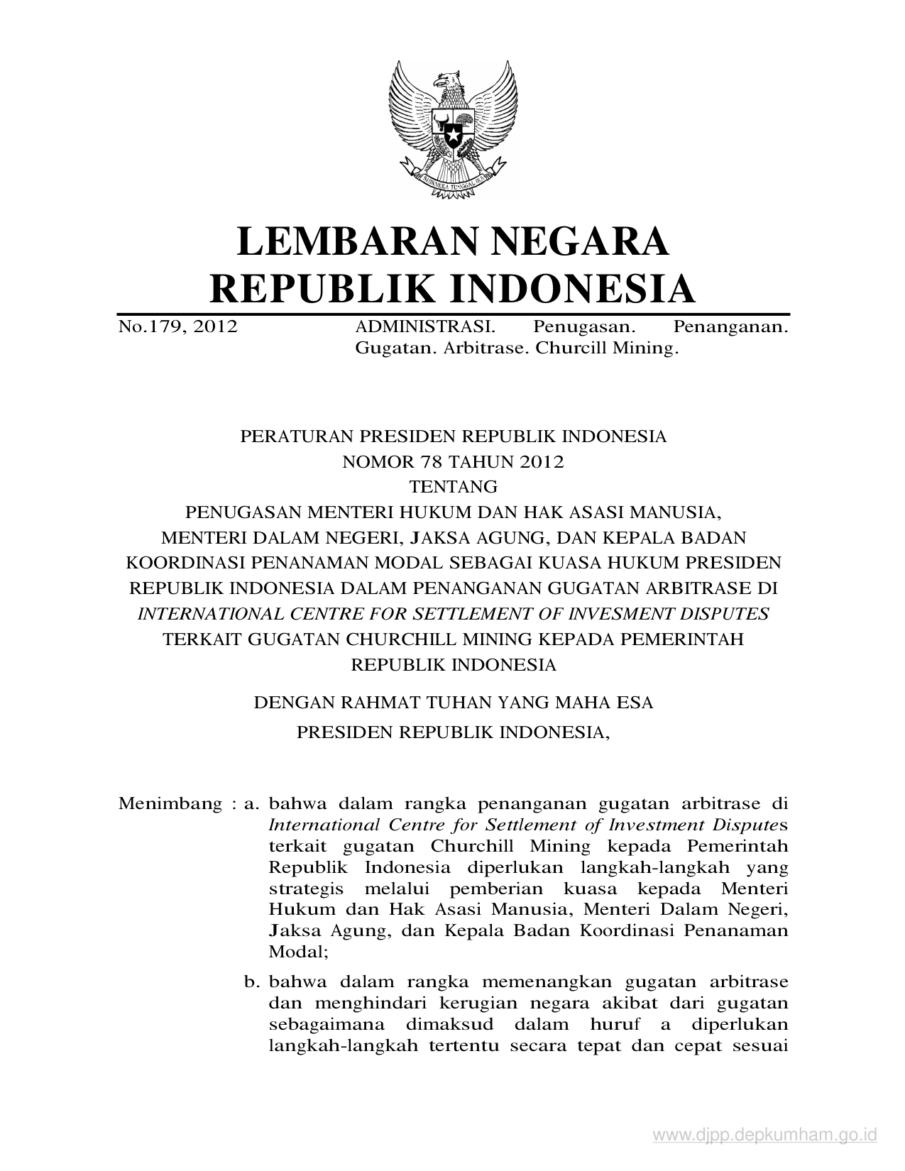 PERPRES Nomor 78 Tahun 2012 | Peraturan Presiden Nomor 78 Tahun 2012 tentang PENUGASAN MENTERI HUKUM DAN HAK ASASI MANUSIA, MENTERI DALAM NEGERI, JAKSA AGUNG, DAN KEPALA BADAN KOORDINASI PENANAMAN MODAL SEBAGAI KUASA HUKUM PRESIDEN REPUBLIK INDONESIA DALAM PENANGANAN GUGATAN ARBITRASE DI INTERNATIONAL CENTRE FOR SETTLEMENT OF INVESMENT DISPUTES TERKAIT GUGATAN CHURCHILL MINING KEPADA PEMERINTAH REPUBLIK INDONESIA