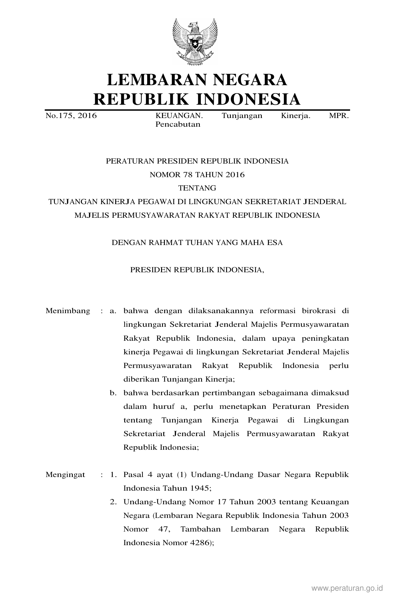 PERPRES Nomor 78 Tahun 2016 | Peraturan Presiden Nomor 78 Tahun 2016 tentang TUNJANGAN KINERJA PEGAWAI DI LINGKUNGAN SEKRETARIAT JENDERAL MAJELIS PERMUSYAWARATAN RAKYAT REPUBLIK INDONESIA