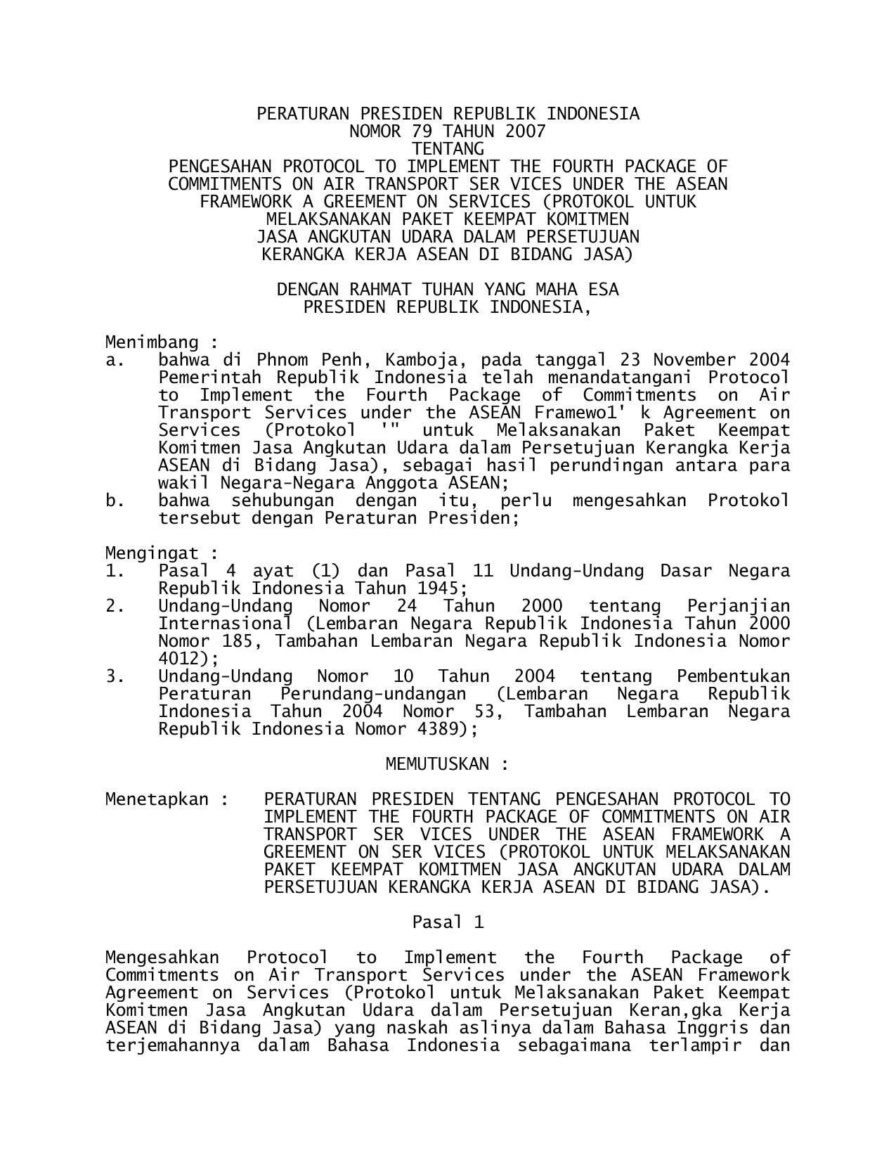 PERPRES Nomor 79 Tahun 2007 | Peraturan Presiden Nomor 79 Tahun 2007 tentang PENGESAHAN PROTOCOL TO IMPLEMENT THE FOURTH PACKAGE OF COMMITMENTS ON AIR TRANSPORT SERVICES UNDER THE ASEAN FRAMEWORK AGREEMENT ON SERVICES (PROTOKOL UNTUK MELAKSANAKAN PAKET KEEMPAT KOMITMEN JASA ANGKUTAN UDARA DALAM PERSETUJUAN KERANGKA KERJA ASEAN DI BIDANG JASA)