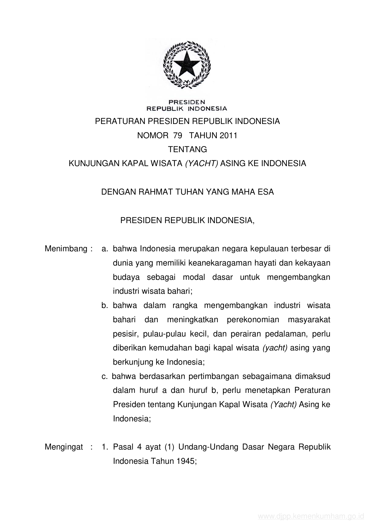 PERPRES Nomor 79 Tahun 2011 | Peraturan Presiden Nomor 79 Tahun 2011 tentang KUNJUNGAN KAPAL WISATA (YACHT) ASING KE INDONESIA
