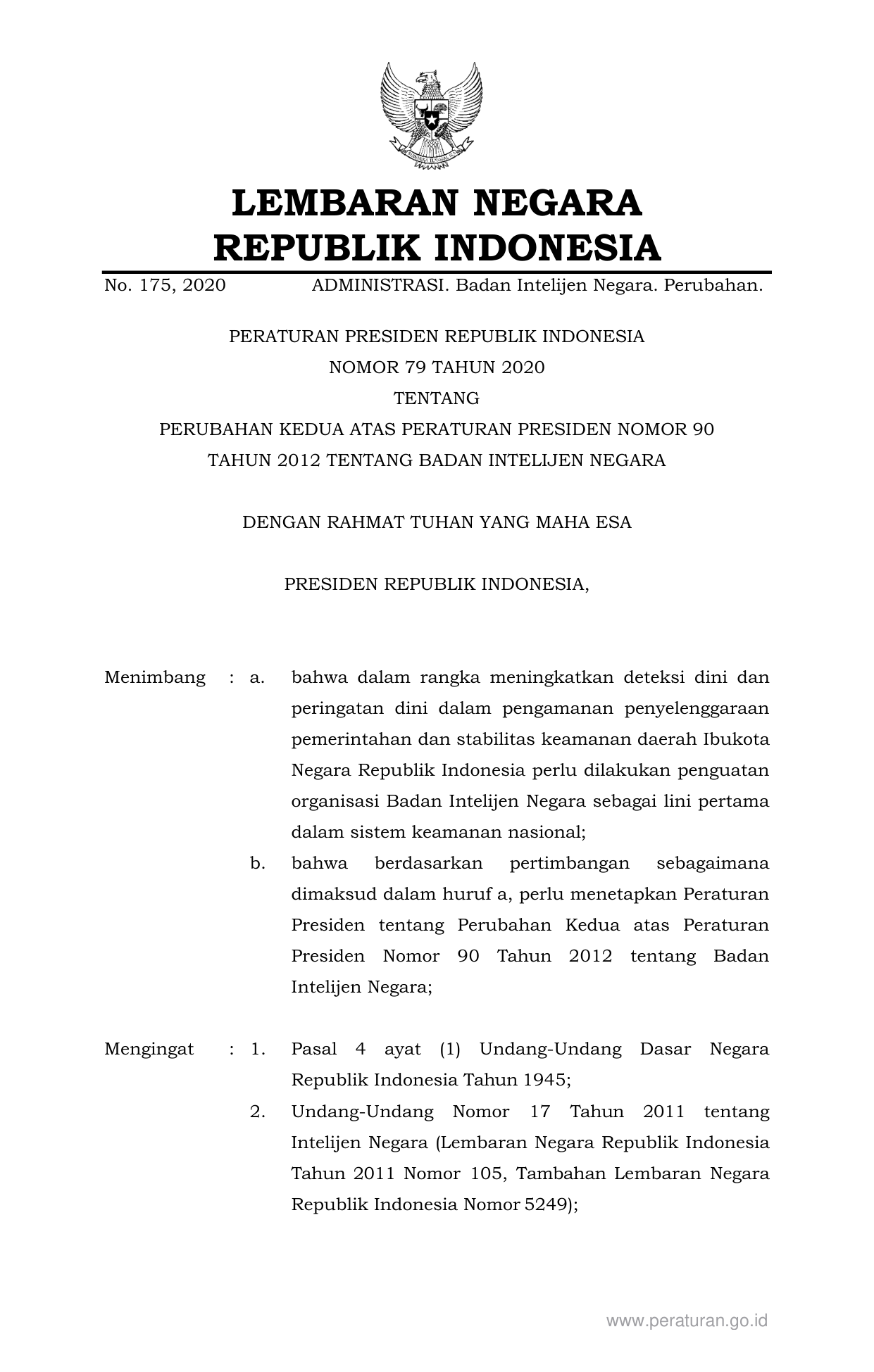PERPRES Nomor 79 Tahun 2020 | Peraturan Presiden Nomor 79 Tahun 2020 tentang PERUBAHAN KEDUA ATAS PERATURAN PRESIDEN NOMOR 90 TAHUN 2012 TENTANG BADAN INTELIJEN NEGARA