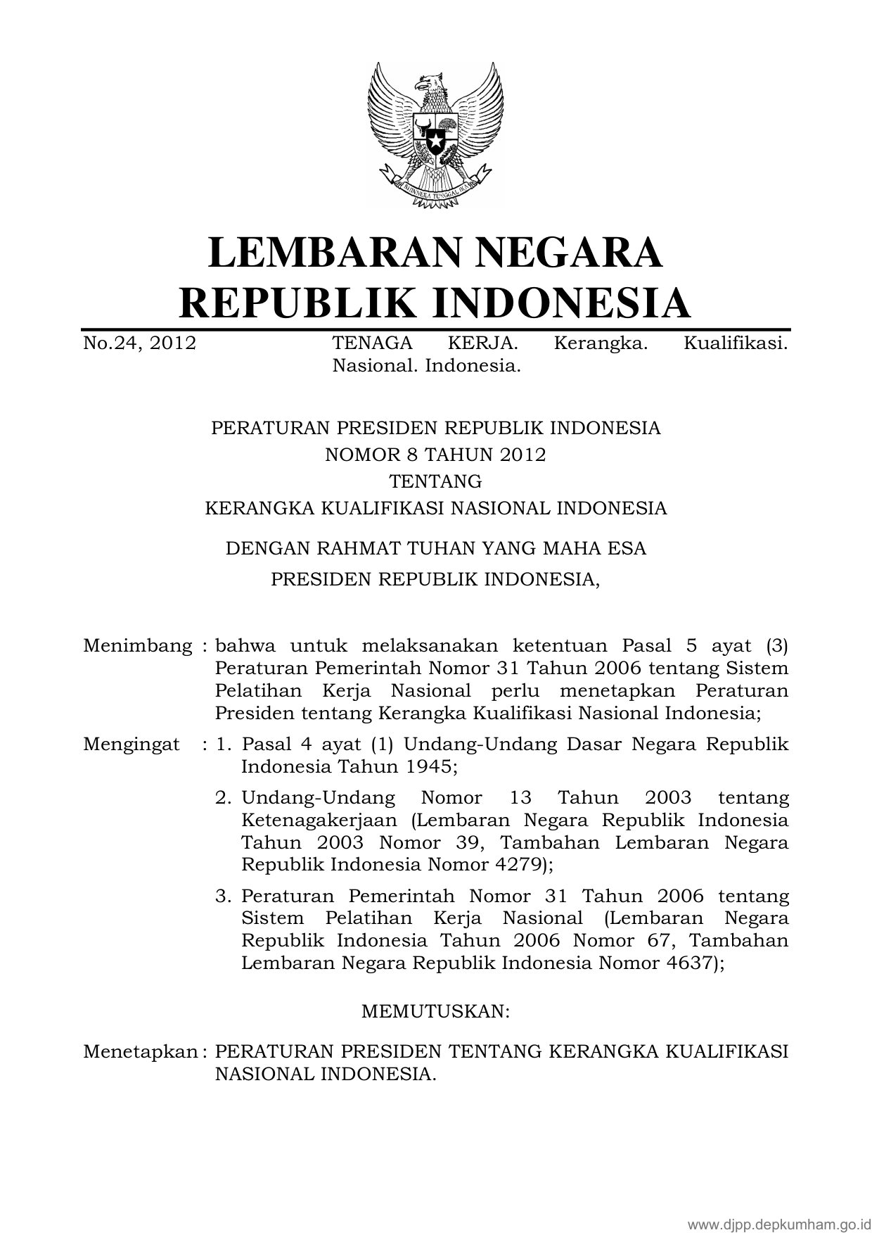 PERPRES Nomor 8 Tahun 2012 | Peraturan Presiden Nomor 8 Tahun 2012 tentang KERANGKA KUALIFIKASI NASIONAL INDONESIA